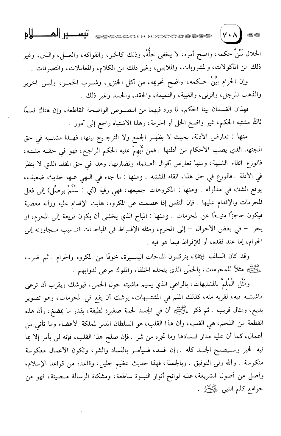ومثَّل المُلمَّ بالمشتبهات، بالراعي الذي يسيم ماشيته حول الحمى، فيوشك ويقرب أن ترعى ماشيته فيه، لقربه منه، كذلك الملم في المشتبهات، يوشك أن يقع في المحرمات، وهو تصوير بديع، ومثال قريب.