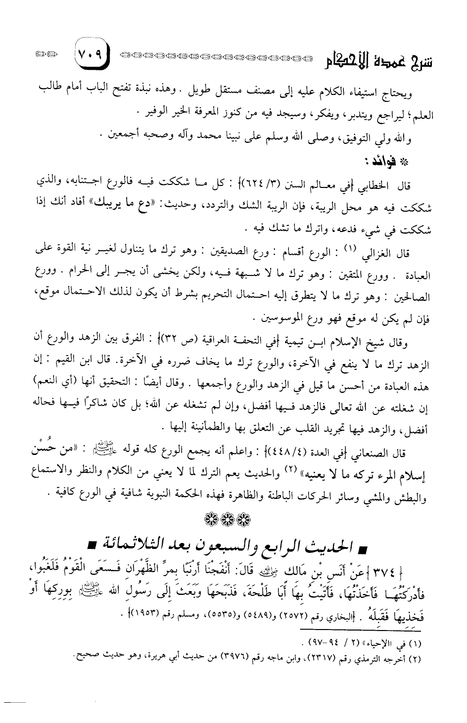 قال الصنعاني: واعلم أنه يجمع الورع كله قوله صلى الله عليه وسلم " من حسن إسلام المرء تركه مالا يعنيه والحديث يعم الترك لما لا يعنى من الكلام والنظر والاستماع والبطش والمشي وسائر الحركات الباطنة والظاهرة فهذه الحكمة النبوية شافية، في الورع كافية.
