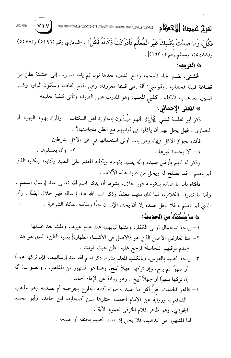 4- ظاهر الحديث حِل أكل ما صيد، سواء أقتله الجارح بجرحه أم بصدمه وهو مذهب الشافعي، ورواية عن الإمام أحمد، اختارها من أصحابه، ابن حامد، وأبو محمد الجوزي، وهو ظاهر كلام الخرقي لعموم الآية.