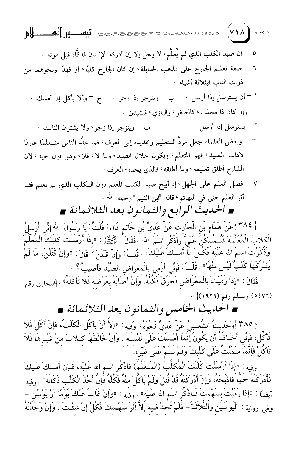 عَنْ هَمَّام بْنِ الحارِثِ عَنْ عَدِي بْنِ حاتِمٍ قَال: قُلْتُ، ْ يا رَسُولَ الله: إني أرسل الْكلابَ الْمُعَلًمَةَ فيمْسِكْنَ عَلَىَّ وَأذْكرُ اسْمَ الله.