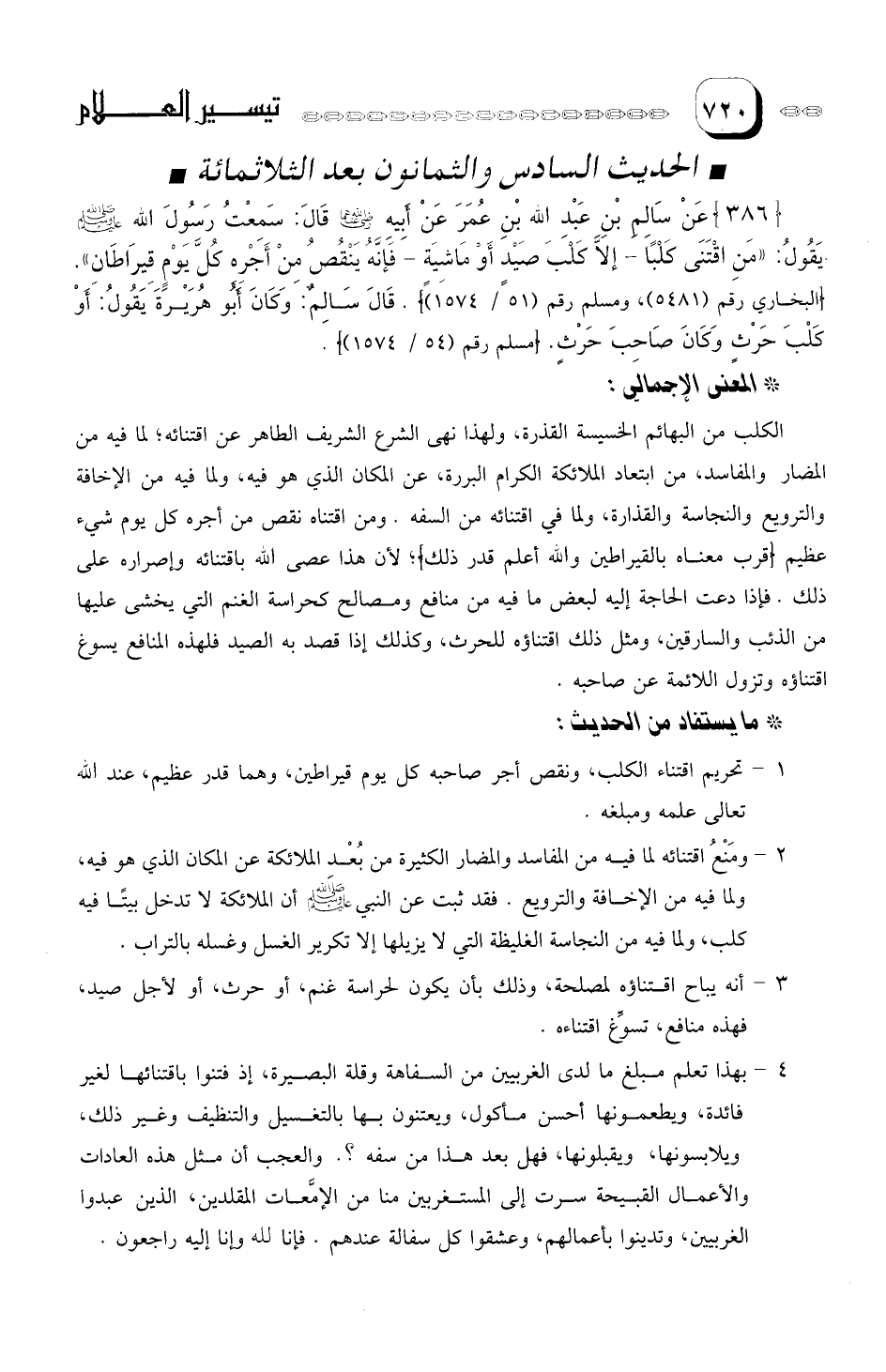 عَنْ سَالِمِ بْنِ عَبْدِ الله بنِ عُمَرَ عَنْ أبيهِ رَضي الله عَنْهُمَا قَالَ: سَمِعْتُ رسول الله صلى الله عليه وسلم يَقُولُ: "مَنِ اقْتَنَى كَلْباً- إلا كَلْبَ صَيْد أوْ مَاشِيَةٍ - فإنَّهُ يَنْقصُ مِنْ أجْرِهِ كُلَّ يَومٍ قيراطان".