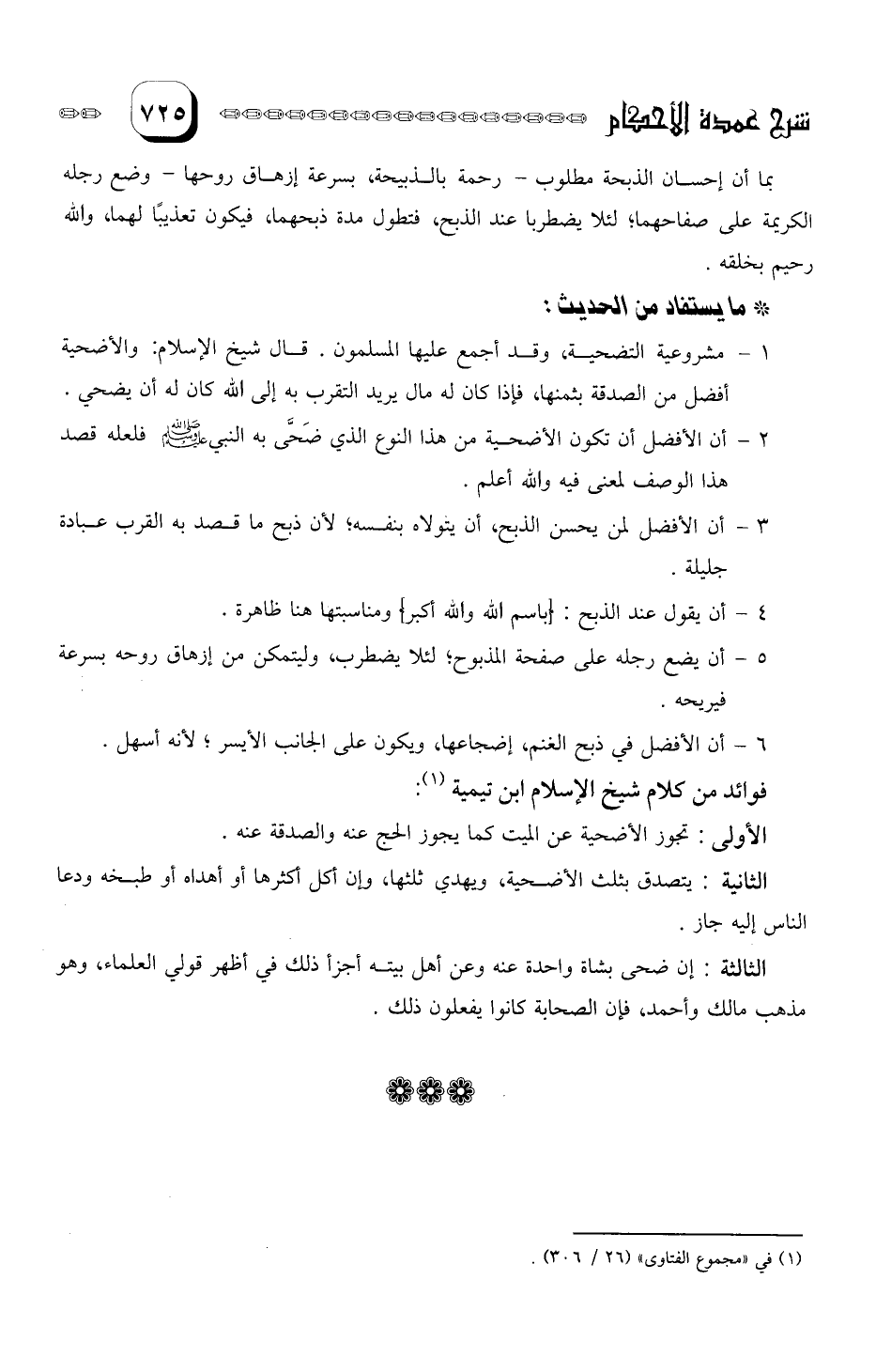 5- أن يضع رجله على صفحة المذبوح لئلا يضطرب، وليتمكن من إرهاق روحه بسرعة فيريحه.