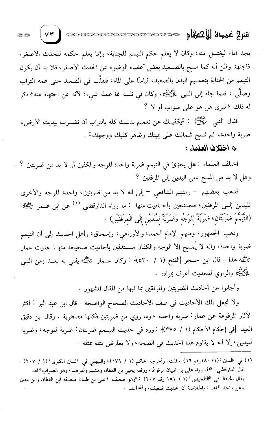 ولا نجعل تلك الأحاديث في صف الأحاديث الصحاح الواضحة. قال ابن عبد البر: أكثر الآثار المرفوعة عن عمار ضربة واحدة. وما روي من ضربتين فكلها مضطربة. وقال ابن دقيق العيد: ورد في حديث التيمم ضربتان، ضربة للوجه، وضربة لليدين، إلا أنه لا يقاوم هذا الحديث في الصحة، ولا يعارض مثله بمثله.