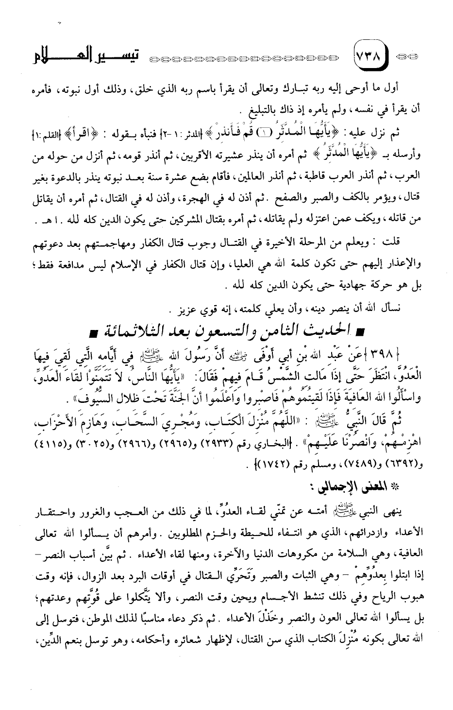 {يا أيها النَّاسُ، لا تَتَمَنَّوْا لِقَاءَ الْعَدُوِّ، واسألوا الله الْعَافِيَةَ، فَإذَا لَقِيتُمُوهُمْ فَاصْبِروُا وَاعْلَمُوا أنَّ الْجَنَّةَ تَحْتَ ظِلالِ السيوفِ} .