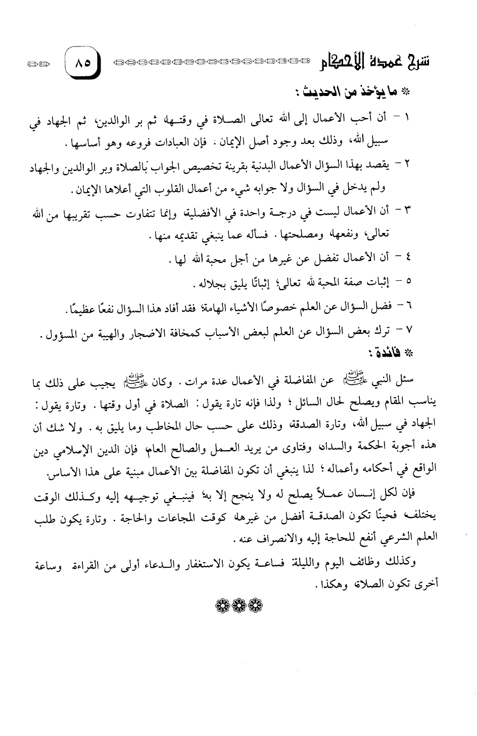 1- أن أحب الأعمال إلى الله تعالى، الصلاة في أوقاتها، ثم بر الوالدين، ثم الجهاد في سبيل الله، وذلك بعد وجود أصل الإيمان. فإن العبادات فروعه وهو أساسها.