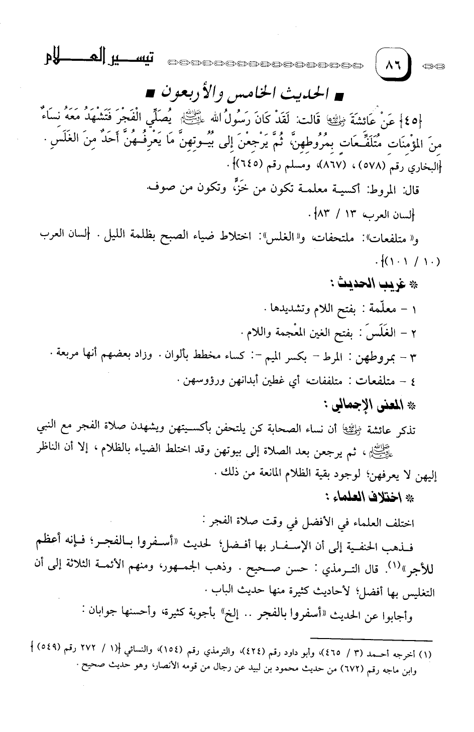 عن عَائشَةَ قالت: لقَدْ كَانَ النبي صلى الله عليه وسلم يصلَيِ الْفجر فَتَشْهَد مَعَهُ نسَاء من الْمُؤْمنَات متَلَفعاتٍ بِمُروطِهِن، ثمَ يرجعن إِلَى بُيُوتِهنَّ مَا يَعْرِفُهُنَّ أحَدٌ من الْغَلَسِ.