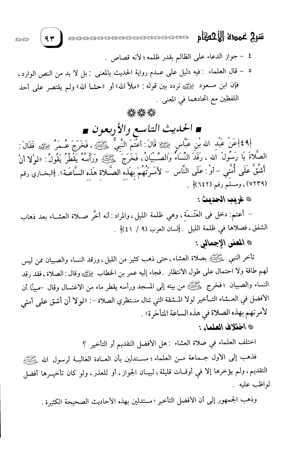 عن عَبدِ الله بْنِ عَبَّاس رَضيَ الله عَنْهُمَا قال: أعْتَمَ النبي صلى الله عليه وسلم، فَخَرَجَ عُمَرُ فَقَالَ: الصَّلاةَ يَا رَسولَ اللَه، رَقَدَ النسَاءُ وَالصبْيَانُ. فَخَرَجَ وَرَأسُه يَقْطُرُ يَقُول: لولا أنْ أشُقَّ عَلَى أمتي -أوْ عَلَي النّاس- لأمَرْتُهُمْ بِهذِه الصّلاةِ هذِهِ السّاعَةَ ".