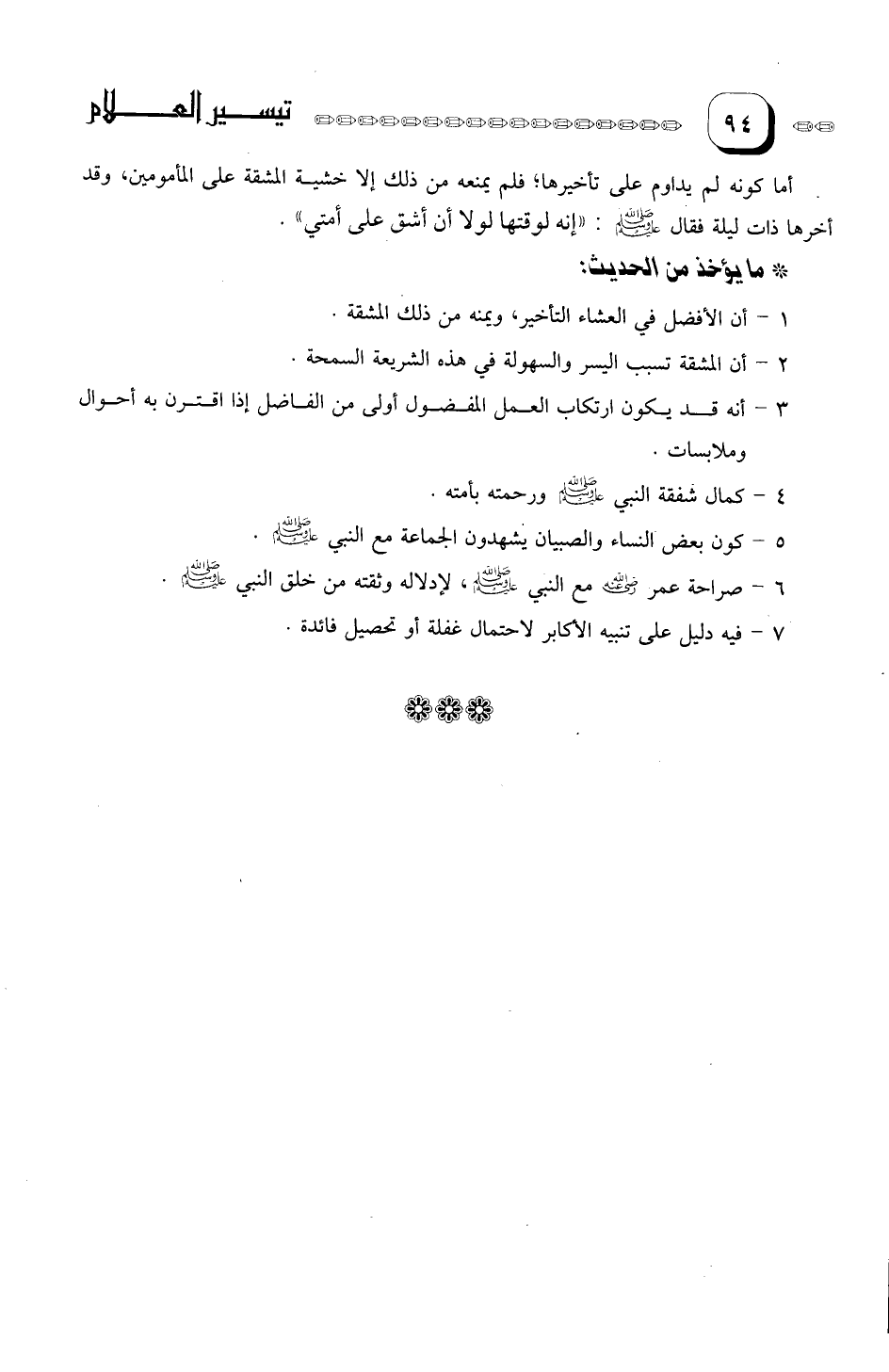 أما كونه لم يداوم على تأخيرها، فلم يمنعه من ذلك إلا خشية المشقة على المأمومين، وقد أخرها ذات ليلة فقال: " إنه لوقتها لولا أن أشق على أمتي ".