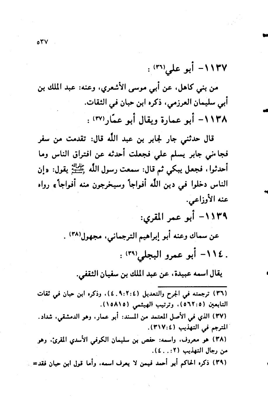 1138 - أَبُو عمَارَة وَيُقَال أَبُو عمار قَالَ حَدثنِي جَار لجَابِر بن عبد الله قَالَ تقدّمت من سفر فَجَاءَنِي جَابر يسلم عَليّ فَجعلت أحدثه عَن افْتِرَاق النَّاس وَمَا أَحْدَثُوا فَجعل يبكي ثمَّ قَالَ سَمِعت رَسُول الله صلى الله عَلَيْهِ وَسلم يَقُول إِن النَّاس دخلُوا فِي دين الله أَفْوَاجًا وَسَيَخْرُجُونَ مِنْهُ أَفْوَاجًا رَوَاهُ عَنهُ الْأَوْزَاعِيّ