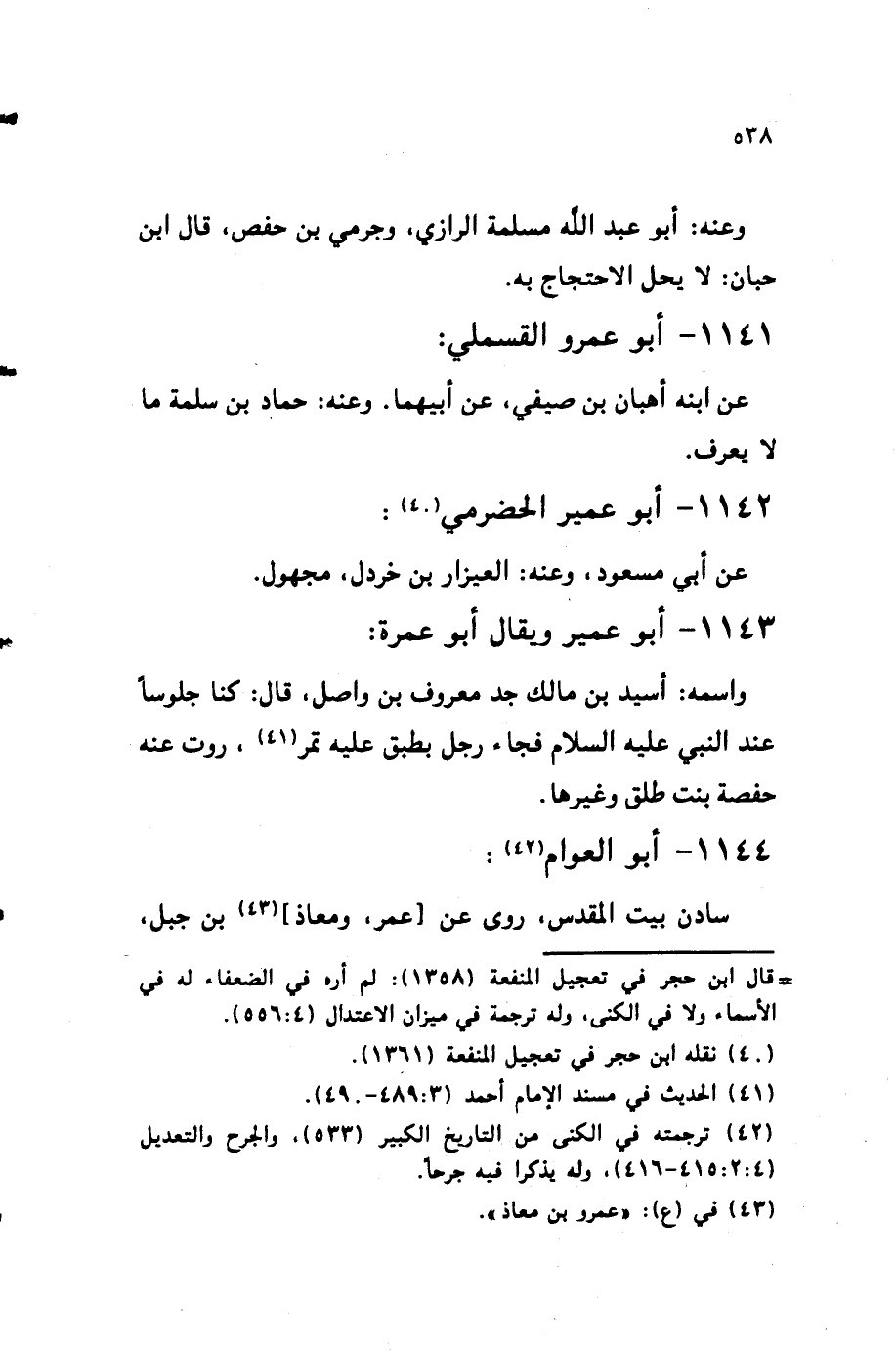 1144 - أَبُو الْعَوام سَادِن بَيت الْمُقَدّس روى عَن عمر ومعاذ بن جبل وَمُعَاوِيَة وَكَعب وَغَيرهم وَعنهُ روح بن عَابِد وَغَيره قَالَ الإِمَام أَحْمد لَا أَدْرِي مَا اسْمه وَذكره بن حبَان فِي الثِّقَات وَقَالَ روى عَن أهل الشَّام ومصر