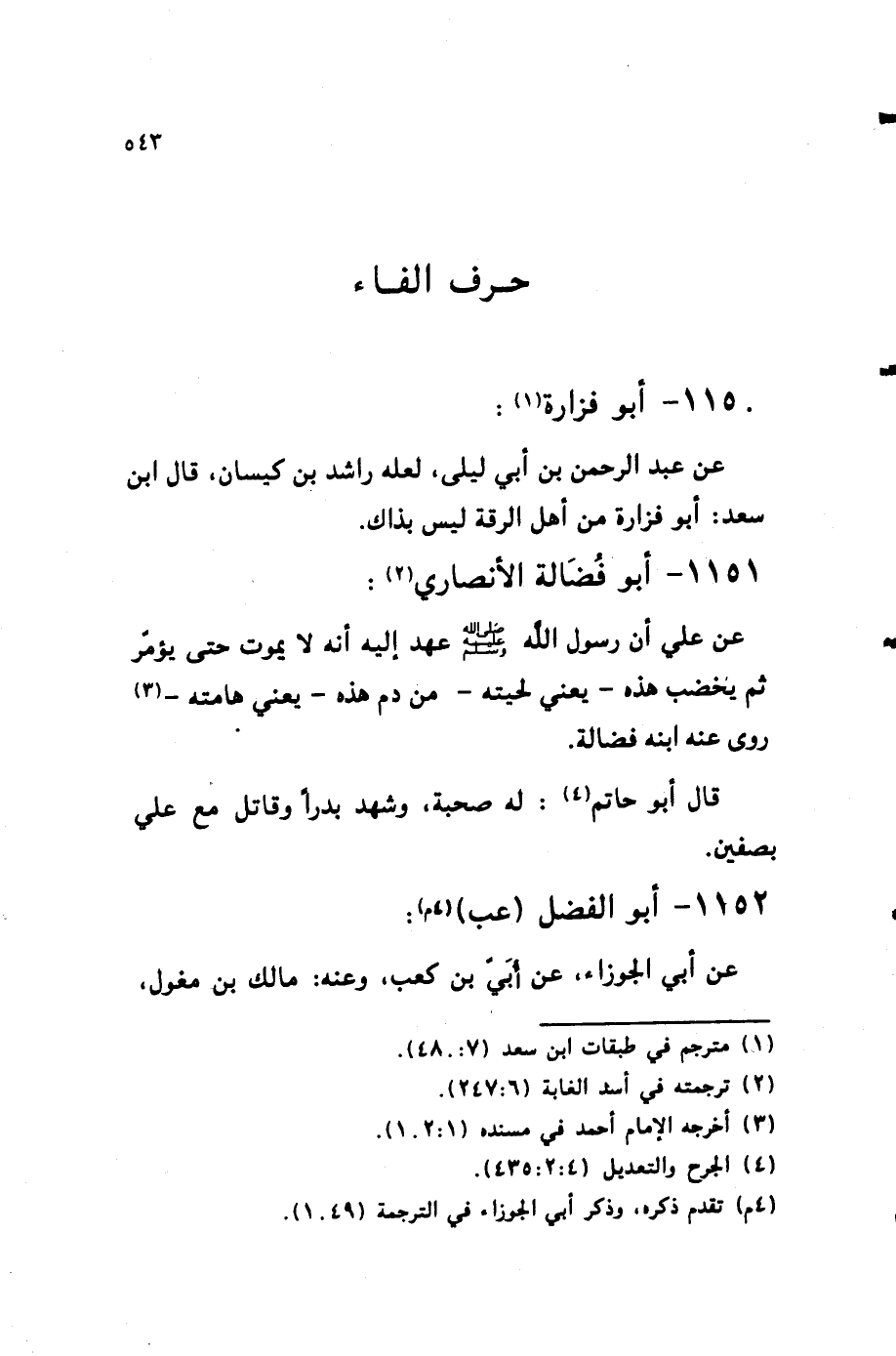 1151 - أَبُو فضَالة الْأنْصَارِيّ عَن عَليّ أَن رَسُول الله صلى الله عَلَيْهِ وَسلم عهد إِلَيْهِ أَنه لَا يَمُوت حَتَّى يُؤمر ثمَّ يخضب هَذِه يَعْنِي لحيته من دم هَذِه يَعْنِي هامته روى عَنهُ ابْنه فضَالة قَالَ أَبُو حَاتِم لَهُ صُحْبَة وَشهد بَدْرًا وَقَاتل مَعَ عَليّ بصفين