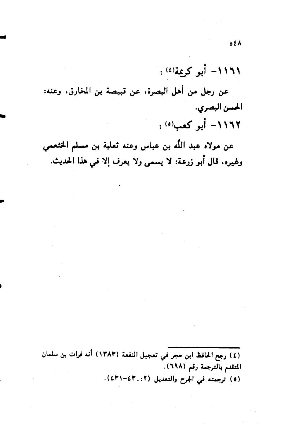 1162 - أَبُو كَعْب عَن مَوْلَاهُ عبد الله بن عَبَّاس وَعنهُ ثَعْلَبَة بن مُسلم الْخَثْعَمِي وَغَيره قَالَ أَبُو زرْعَة لَا يُسمى وَلَا يعرف إِلَّا فِي هَذَا الحَدِيث