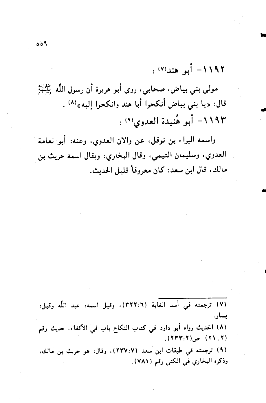 1192 - أَبُو هِنْد مولى بني بَيَاض صَحَابِيّ روى أَبُو هُرَيْرَة أَن رَسُول الله صلى الله عَلَيْهِ وَسلم قَالَ يَا بني بَيَاض أنكحوا أَبَا هِنْد وَانْكِحُوا إِلَيْهِ