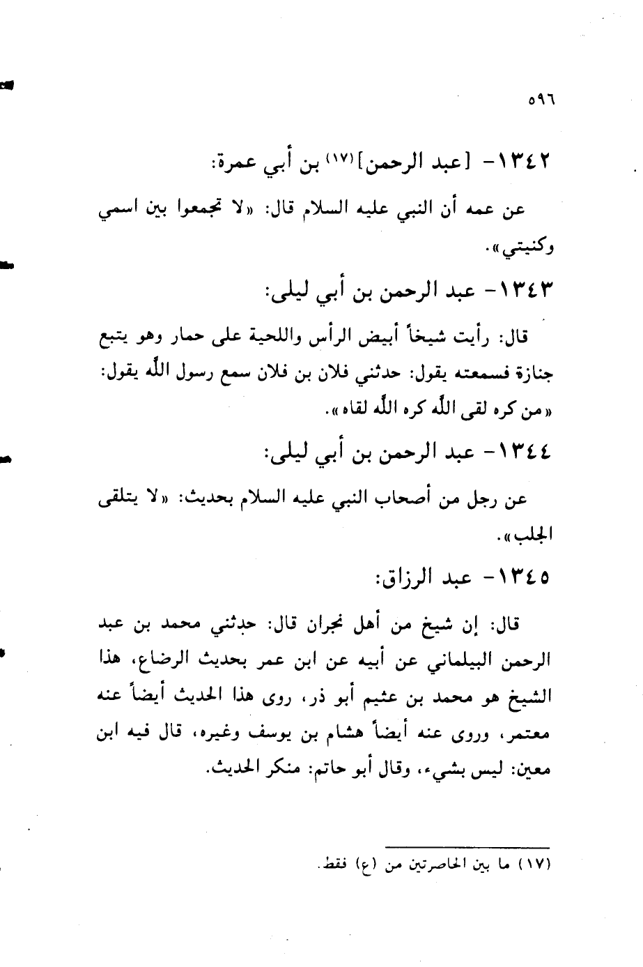 1345 - عبد الرَّزَّاق قَالَ إِن شيخ من أهل نَجْرَان قَالَ حَدثنِي مُحَمَّد بن عبد الرَّحْمَن الْبَيْلَمَانِي عَن أَبِيه عَن بن عمر بِحَدِيث الرَّضَاع هَذَا الشَّيْخ هُوَ مُحَمَّد بن عثيم أَبُو ذَر روى هَذَا الحَدِيث أَيْضا عَنهُ مُعْتَمر وروى عَنهُ أَيْضا هِشَام بن يُوسُف وَغَيره قَالَ فِيهِ بن معِين لَيْسَ بِشَيْء وَقَالَ أَبُو حَاتِم مُنكر الحَدِيث
