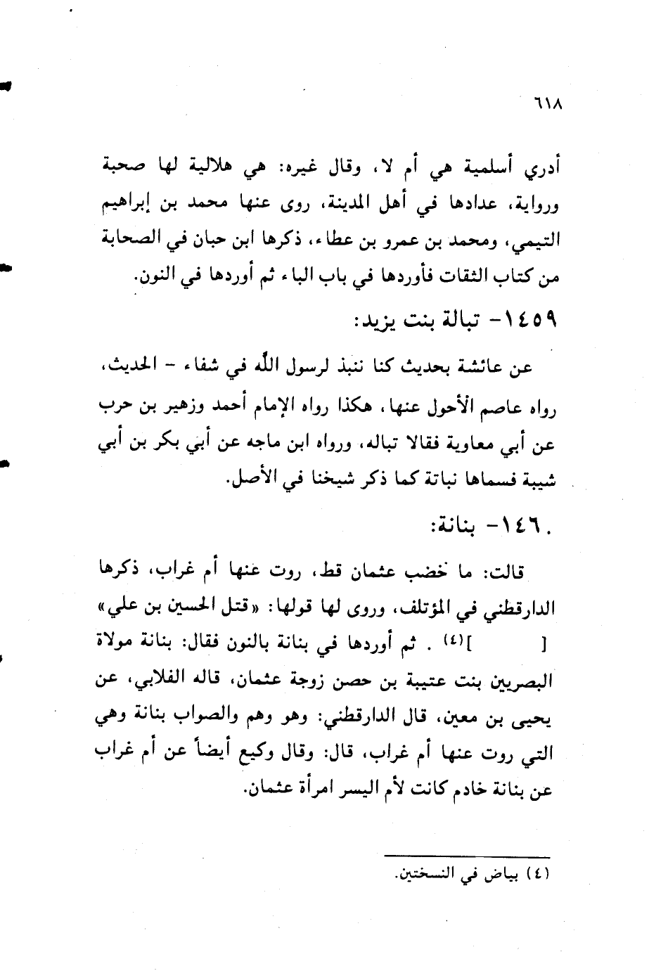 1460 - بنانة قَالَت مَا خضب عُثْمَان قطّ رَوَت عَنْهَا أم غراب ذكرهَا الدَّارَقُطْنِيّ فِي المؤتلف وروى لَهَا قَوْلهَا قتل الْحُسَيْن بن عَليّ ثمَّ أوردهَا فِي بنانة بالنُّون فَقَالَ بنانة مولاة الْبَصرِيين بنت عتيبة بن حصن زَوْجَة عُثْمَان قَالَه الفلابي عَن يحيى بن معِين قَالَ الدَّارَقُطْنِيّ وَهُوَ وهم وَالصَّوَاب بنانة وَهِي الَّتِي رَوَت عَنْهَا أم غراب قَالَ وَقَالَ وَكِيع أَيْضا عَن أم غراب عَن بنانة خَادِم كَانَت لأم الْيُسْر امْرَأَة عُثْمَان