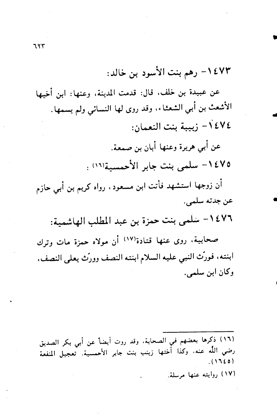 1476 - سلمى بنت حَمْزَة بن عبد الْمطلب الهاشمية صحابية روى عَنْهَا قَتَادَة أَن مَوْلَاهُ حَمْزَة مَاتَ وَترك ابْنَته فورث النَّبِي عَلَيْهِ السَّلَام ابْنَته النّصْف وَورث يعلى النّصْف وَكَانَ بن سلمى