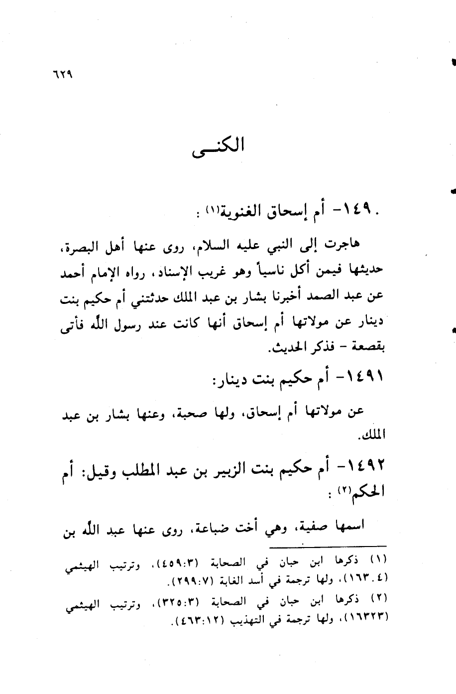 1492 - أم حَكِيم بنت الزبير بن عبد الْمطلب وَقيل أم الحكم اسْمهَا صَفِيَّة وَهِي أُخْت ضباعة روى عَنْهَا عبد الله بن الْحَارِث بن نَوْفَل أَنَّهَا حدثته أَن النَّبِي عَلَيْهِ السَّلَام دخل على ضباعة بنت الزبير فنهش من كتف عِنْدهَا ثمَّ صلى وَمَا تَوَضَّأ من ذَلِك ثمَّ قَالَ قَتَادَة عَن إِسْحَاق بن عبد الله بن الْحَارِث بن نَوْفَل عَن أم حَكِيم بنت الزبير أَنَّهَا ناولت نَبِي الله كَتفًا الحَدِيث قَالَ شَيخنَا فِي التَّهْذِيب أم الحكم وَيُقَال أم حَكِيم صَفِيَّة وَيُقَال عَاتِكَة وَيُقَال ضباعة