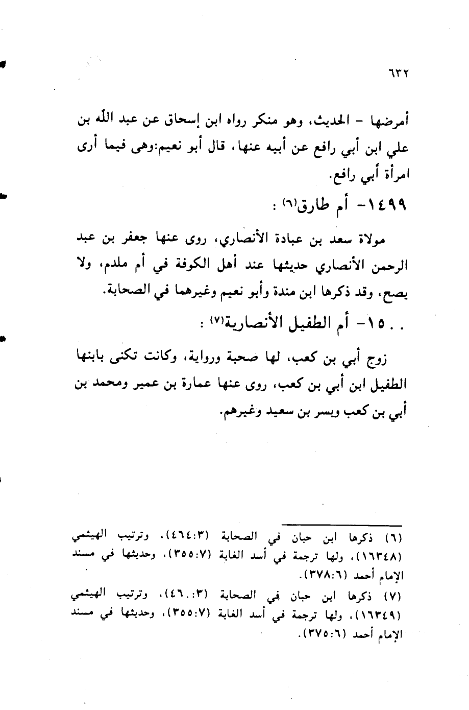 1499 - أم طَارق مولاة سعد بن عبَادَة الْأنْصَارِيّ روى عَنْهَا جَعْفَر بن عبد الرَّحْمَن الْأنْصَارِيّ حَدِيثهَا عِنْد أهل الْكُوفَة فِي أم ملدم وَلَا يَصح وَقد ذكرهَا بن مندة وَأَبُو نعيم وَغَيرهمَا فِي الصَّحَابَة