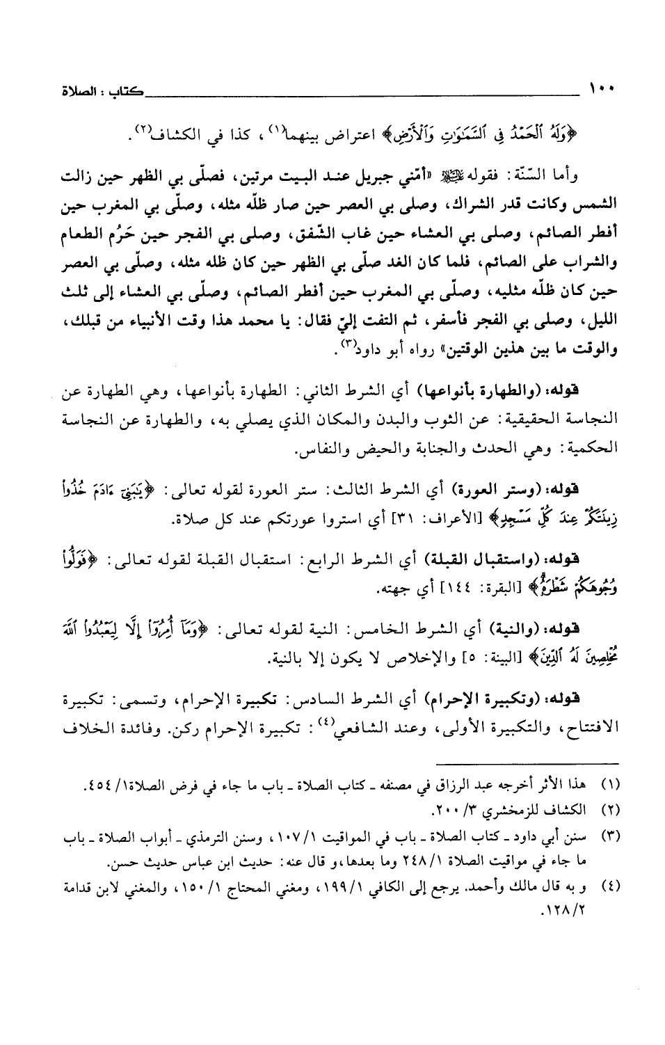 وأما السنة: فقوله عليه السلام "أمني جبريل عند البيت مرتين، فصلى بي الظهر حين زالت الشمس وكانت قدر الشراك، وصلى بي العصر حين صار ظله مثله، وصلى بي المغرب حين أفطر الصائم، وصلى بي العشاء حين غاب الشفق، وصلى بي الفجر حين حرم الطعام والشراب على الصائم، فلما كان الغد صلى بي الظهر حين كان ظله مثله، وصلى بي العصر حين كان ظله مثليه، وصلى بي المغرب حين أفطر الصائم، وصلى بي العشاء إلى ثلث الليل، وصلى بي الفجر فأسفر، ثم التفت إلي فقال: يا محمد هذا وقت الأنبياء من قبلك، والوقت ما بين هذين الوقتين" رواه أبو داود.