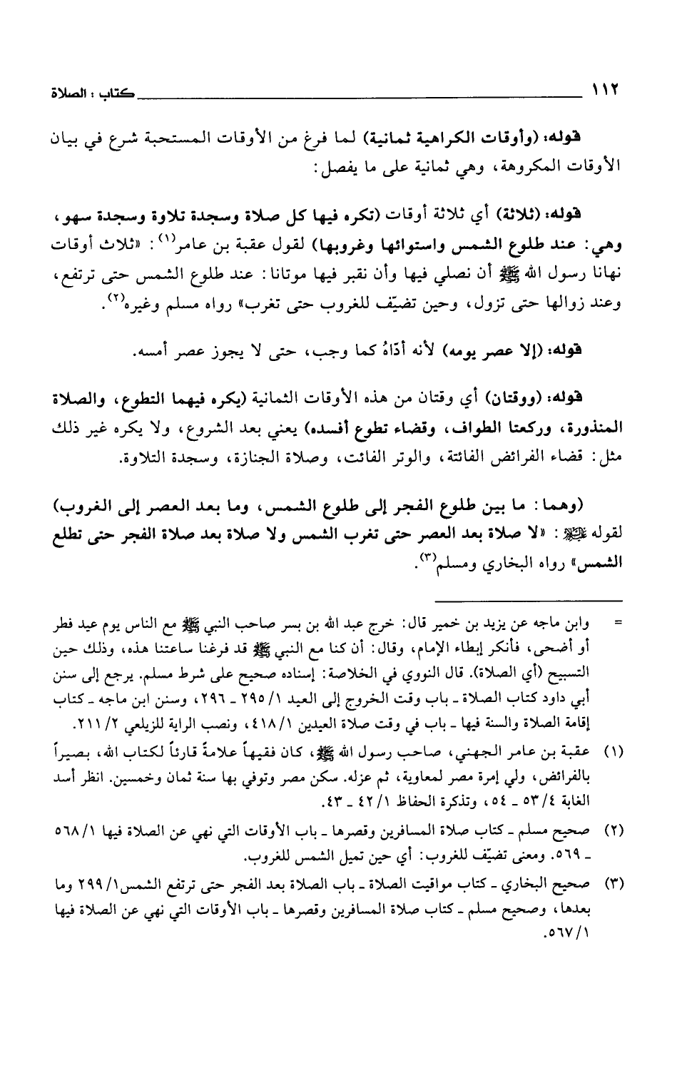 قوله: (ثلاثة) أي ثلاثة أوقات (تكره فيها كل صلاة وسجدة تلاوة وسجدة سهو، وهي: عند طلوع الشمس واستوائها وغروبها) لقول عقبة بن عامر: "ثلاث أوقات نهانا رسول الله صلى الله عليه وسلم أن نصلي فيها وأن نقبر فيها موتانا: عند طلوع الشمس حتى ترتفع، وعند زوالها حتى تزول، وحين تضيف للغروب حتى تغرب" رواه مسلم وغيره.