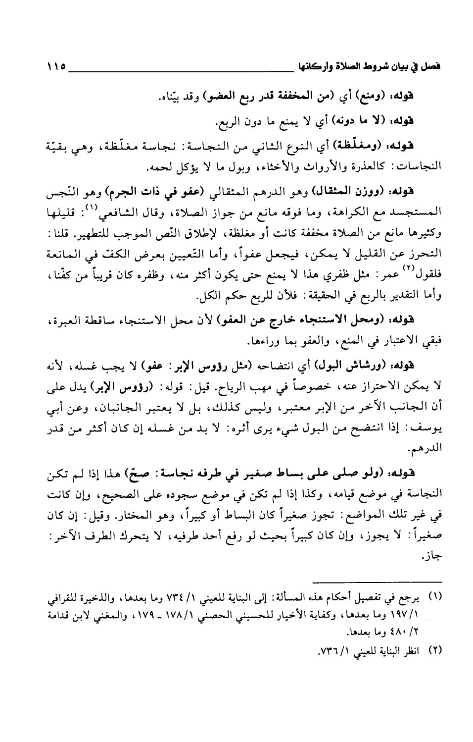 قوله: (ووزن المثقال) وهو الدرهم المثقالي (عفو في ذات الجرم) وهو النجس المستجسد مع الكراهة، وما فوقه مانع من جواز الصلاة، وقال الشافعي: قليلها وكثيرها مانع من الصلاة مخففة كانت أو مغلظة، لإطلاق النص الموجب للتطهير. قلنا: التحرز عن القليل لا يمكن، فيجعل عفواً، وأما التعيين بعرض الكف في المانعة فلقول عمر: مثل ظفري هذا لا يمنع حتى يكون أكثر منه، وظفره كان قريباً من كفنا، وأما التقدير بالربع في الحقيقة: فلأن للربع حكم الكل.