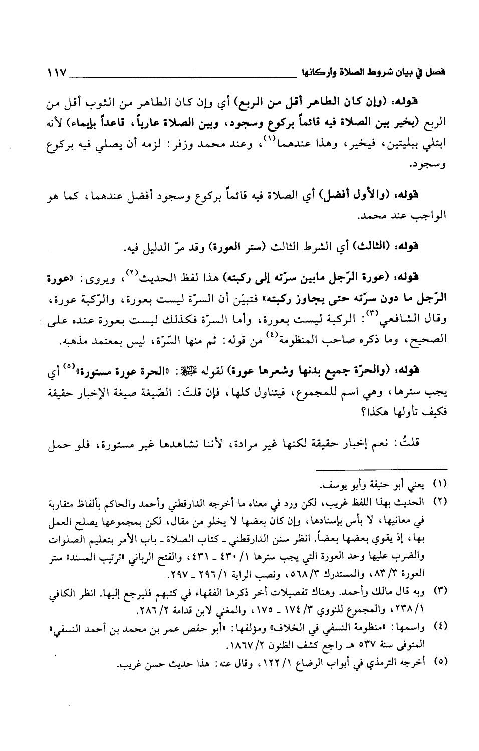 قوله: (وإن كان الطاهر أقل من الربع) أي وإن كان الطاهر من الثوب أقل من الربع (يخير بين الصلاة فيه قائماً بركوع وسجود، وبين الصلاة عارياً، قاعداً بإيماء) لأنه ابتلي ببليتين، فيخير، وهذا عندهما، وعند محمد وزفر: لزمه أن يصلي فيه بركوع وسجود.