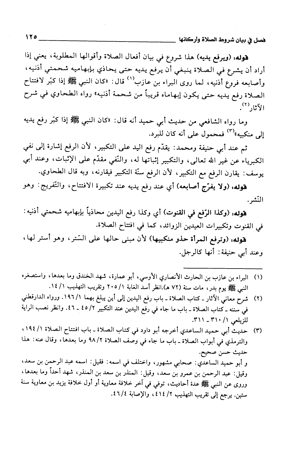 ثم عند أبي حنيفة ومحمد: يقدم رفع اليد على التكبير، لأن الرفع إشارة إلى نفي الكبرياء عن غير الله تعالى، والتكبير إثباتها له، والنفي مقدم على الإثبات، وعند أبي يوسف: يقارن الرفع مع التكبير، لأن الرفع سنة التكبير فيقارنه، وبه قال الطحاوي.