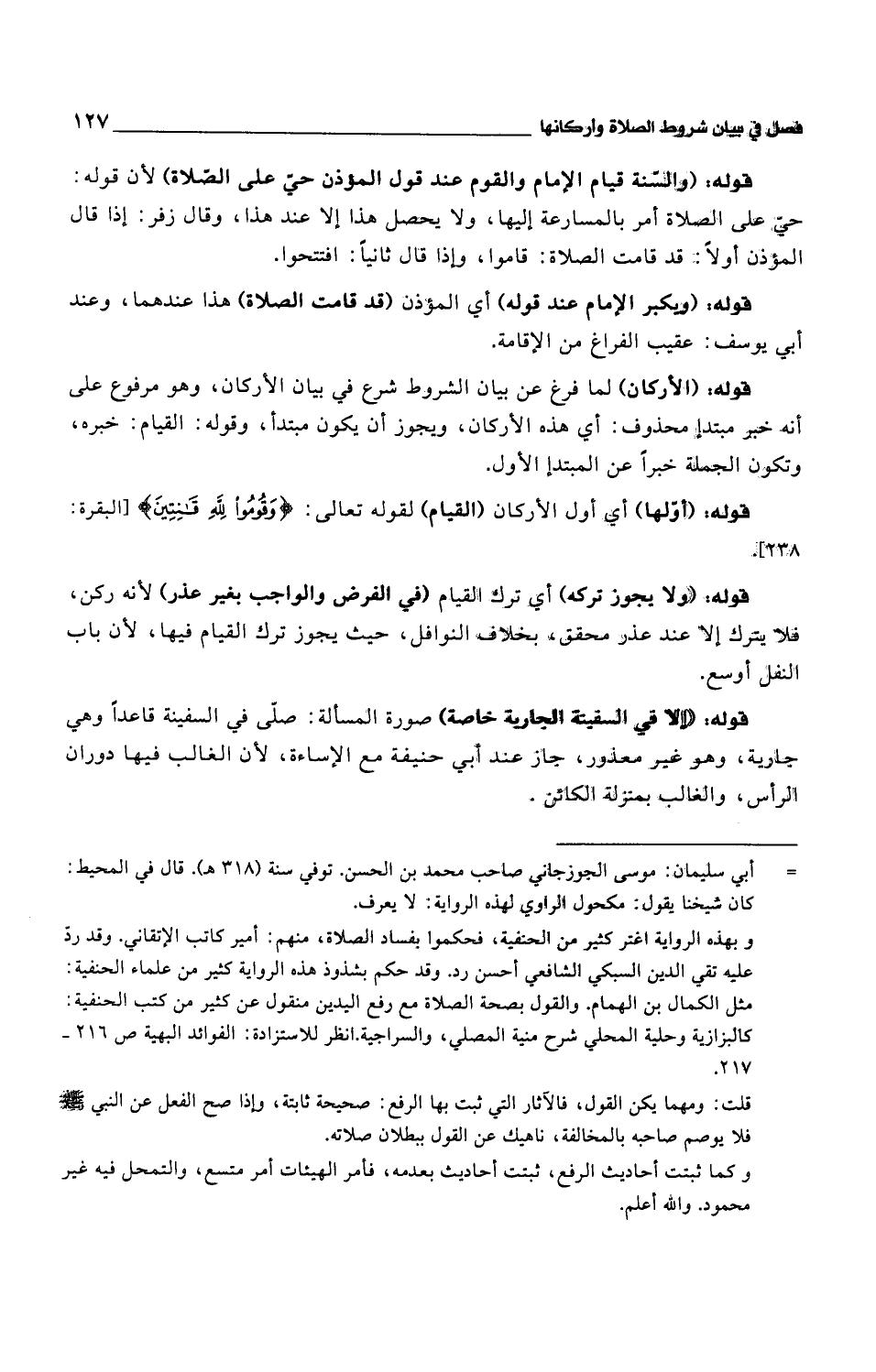 قوله: (إلا في السفينة الجارية خاصة) صورة المسألة: صلى في السفينة قاعداً وهي جارية، وهو غير معذور، جاز عند أبي حنيفة مع الإساءة، لأن الغالب فيها دوران الرأس، والغالب بمنزلة الكائن.