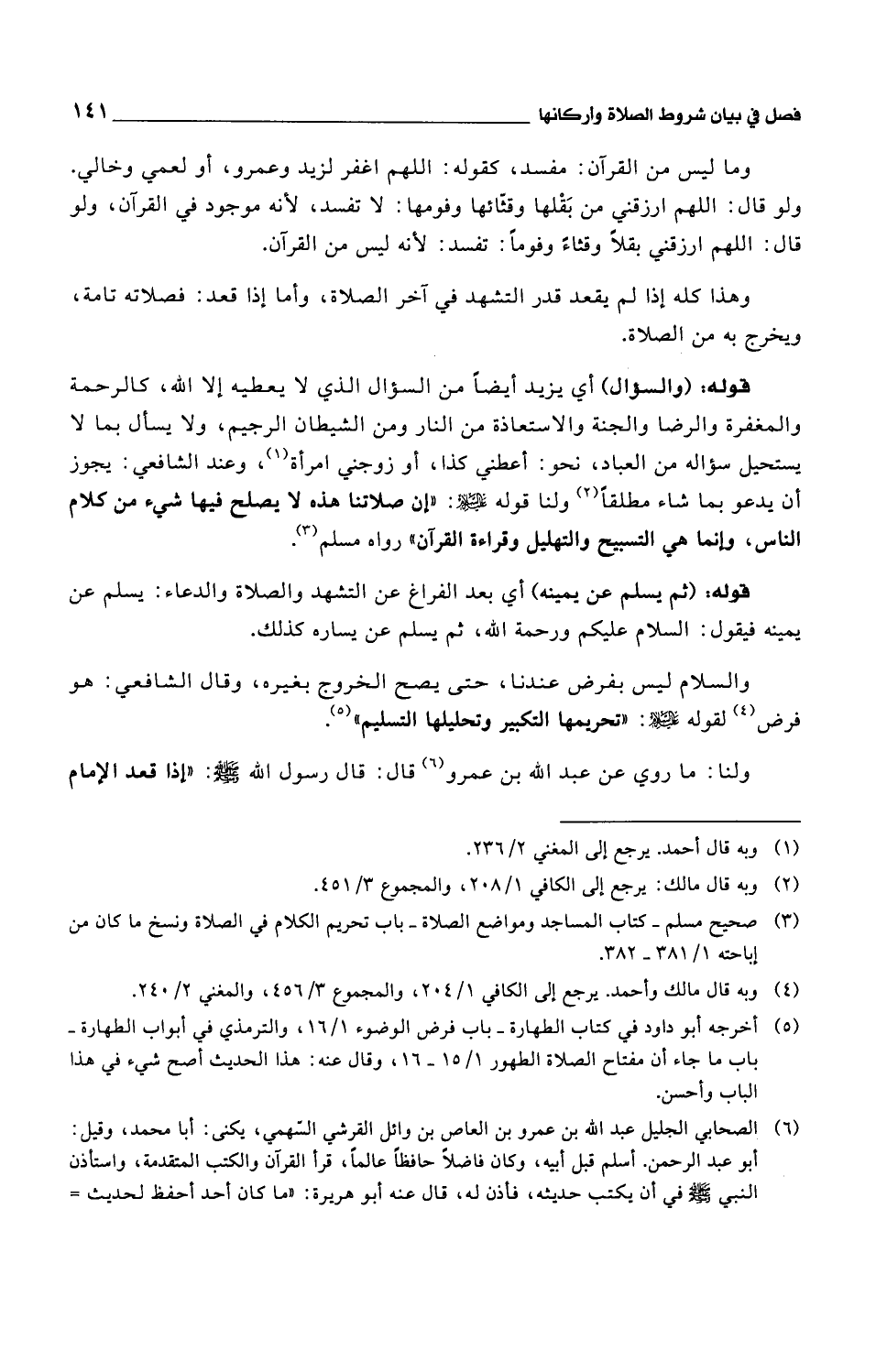 وما ليس من القرآن: مفسد، كقوله: اللهم اغفر لزيد وعمرو، أو لعمي وخالي. ولو قال: اللهم ارزقني من بقلها وقثائها وفومها: لا تفسد، لأنه موجود في القرآن، ولو قال: اللهم ارزقني بقلاً وقثاءً وفوماً: تفسد: لأنه ليس من القرآن.