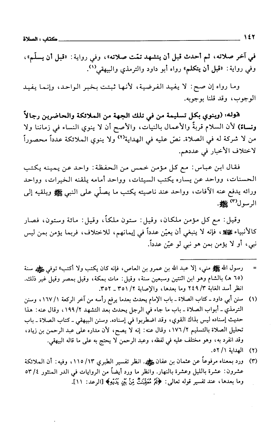 قوله: (وينوي بكل تسليمة من في تلك الجهة من الملائكة والحاضرين رجالاً ونساءً) لأن السلام قربة والأعمال بالنيات، والأصح أن لا ينوي النساء في زماننا ولا من لا شركة له في الصلاة. نص عليه في الهداية ولا ينوي الملائكة عدداً محصوراً لاختلاف الأخبار في عددهم.