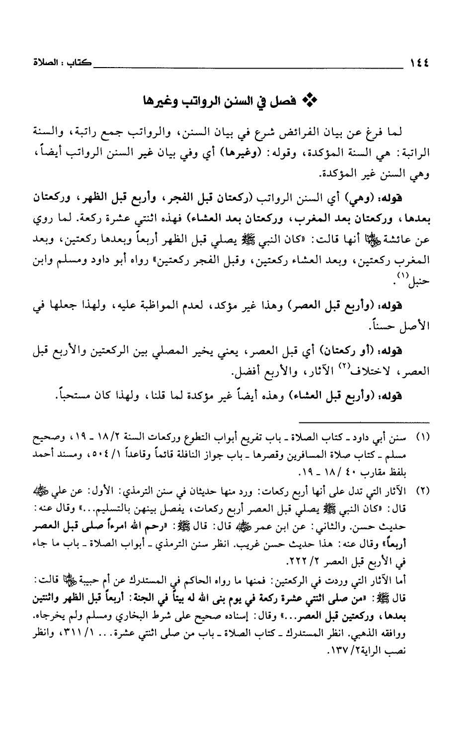 قوله: (وهي) أي السنن الرواتب (ركعتان قبل الفجر، وأربع قبل الظهر، وركعتان بعدها، وركعتان بعد المغرب، وركعتان بعد العشاء) فهذه اثنتي عشرة ركعة. لما روي عن عائشة رضي الله عنها أنها قالت: "كان النبي صلى الله عليه وسلم يصلي قبل الظهر أربعاً وبعدها ركعتين، وبعد المغرب ركعتين، وبعد العشاء ركعتين، وقبل الفجر ركعتين" رواه أبو داود ومسلم وابن حنبل.