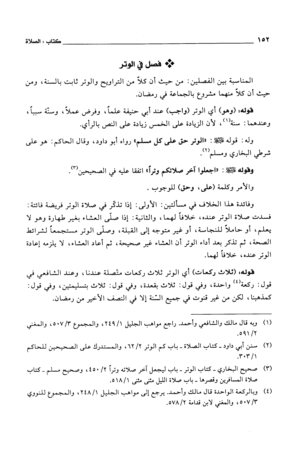 وله: قوله عليه السلام: "الوتر حق على كل مسلم" رواه أبو داود، وقال الحاكم: هو على شرطي البخاري ومسلم.