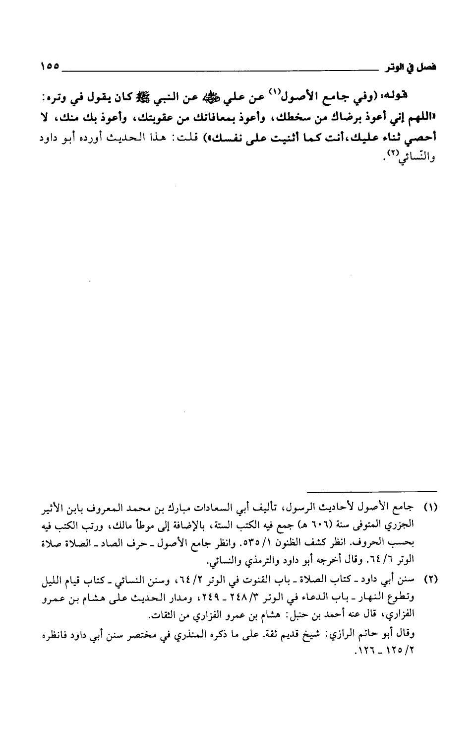 قوله: (وفي جامع الأصول عن علي رضي الله عنه عن النبي صلى الله عليه وسلم كان يقول في وتره: "اللهم إني أعوذ برضاك من سخطك، وأعوذ بمعافاتك من عقوبتك، وأعوذ بك منك، لا أحصي ثناء عليك، أنت كما أثنيت على نفسك") قلت: هذا الحديث أورده أبو داود والنسائي.
