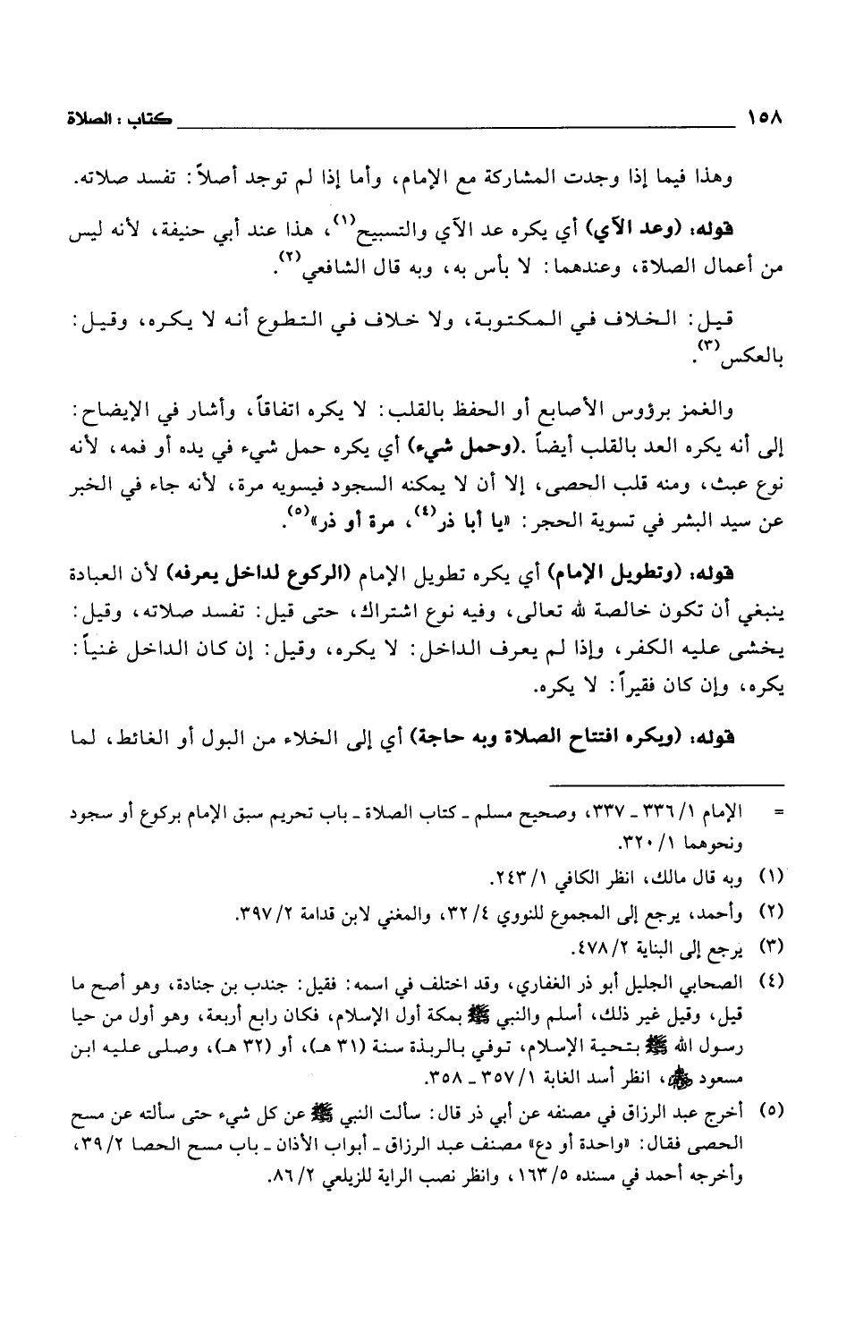 والغمز برءوس الأصابع أو الحفظ بالقلب: لا يكره اتفاقاً، وأشار في الإيضاح: إلى أن يكره العد بالقلب أيضاً. (وحمل شيء) أي يكره حمل شيء في يده أو فمه، لأنه نوع عبث، ومنه قلب الحصى، إلا أن لا يمكنه السجود فيسويه مرة، لأنه جاء في الخبر عن سيد البشر في تسوية الحجر: "يا أبا ذر، مرة أو ذر".