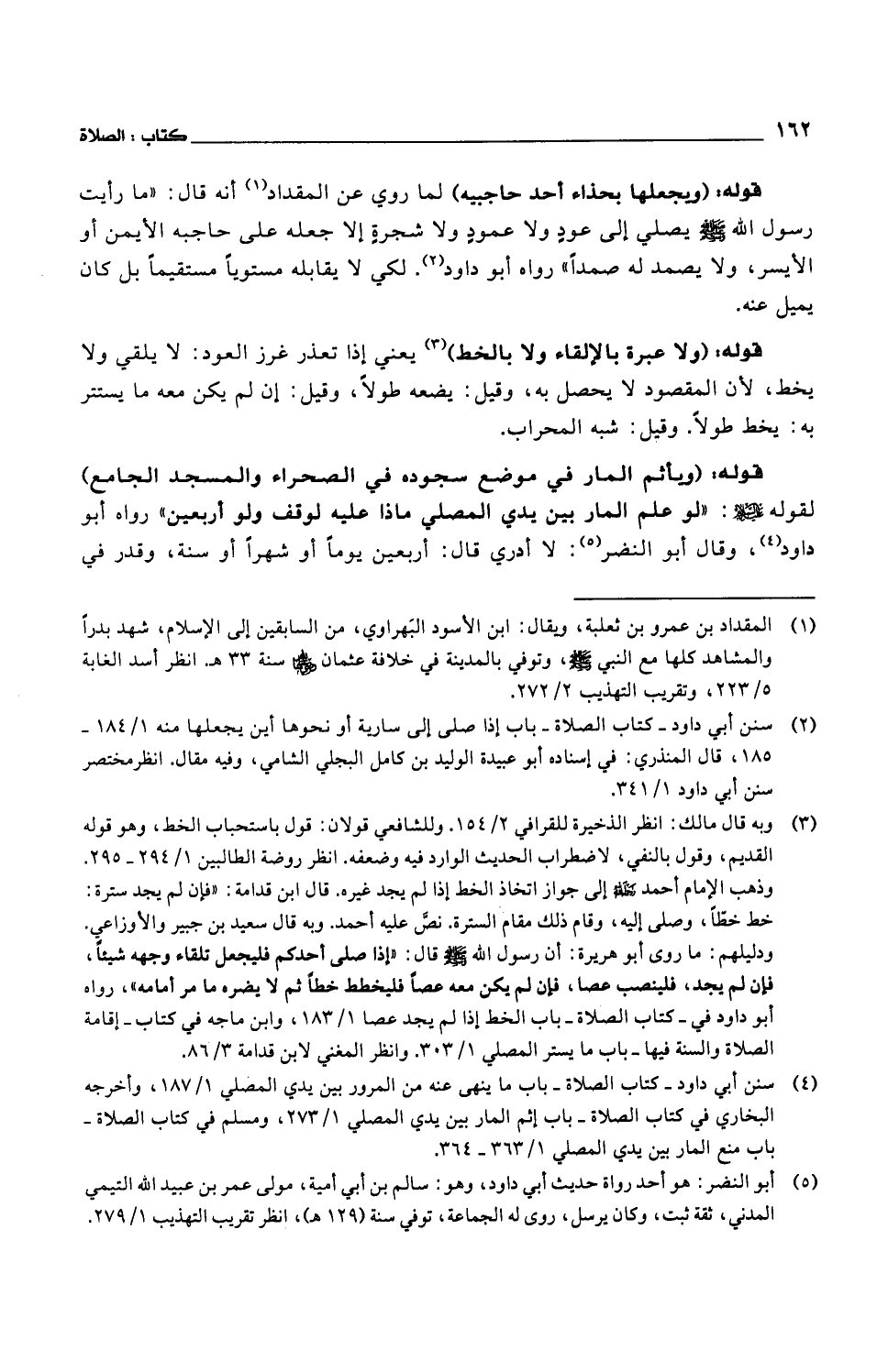 قوله: (ويأثم المار في موضع سجوده في الصحراء والمسجد الجامع) لقوله عليه السلام: "لو علم المار بين يدي المصلي ماذا عليه لوقف ولو أربعين" رواه أبو داود، وقال أبو النضر: لا أدري قال: أربعين يوماً أو شهراً أو سنة، وقدر في