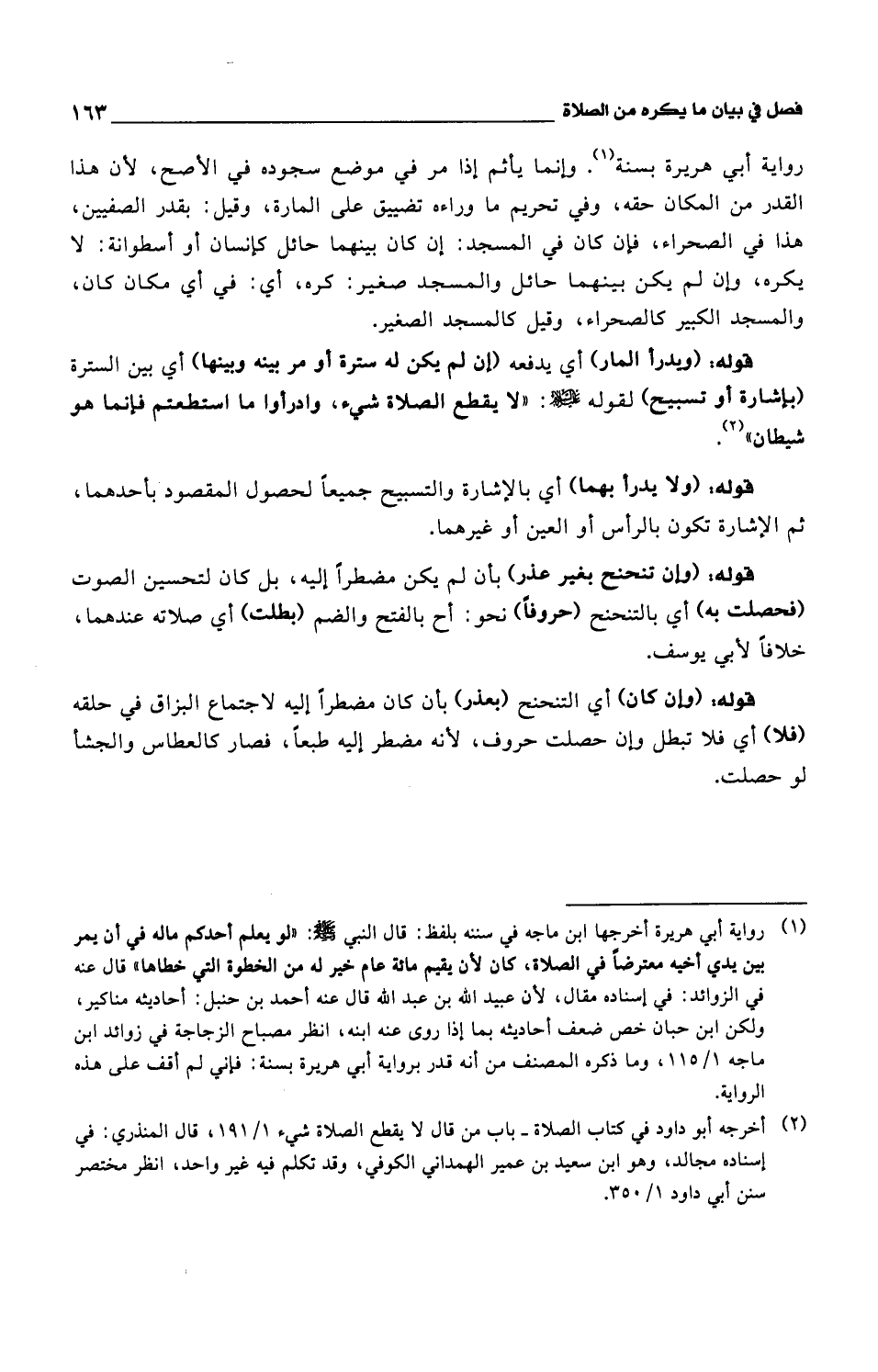 رواية أبي هريرة بسنة. وإنما يأثم إذا مر في موضع سجوده في الأصح، لأن هذا القدر من المكان حقه، وفي تحريم ما وراءه تضييق على المارة، وقيل: بقدر الصفيين، هذا في الصحراء، فإن كان في المسجد: إن كان بينهما حائل كإنسان أو اسطوانة: لا يكره، وإن لم يكن بينهما حائل والمسجد صغير: كره، أي: في أي مكان كان، والمسجد الكبير كالصحراء، وقيل كالمسجد الصغير.