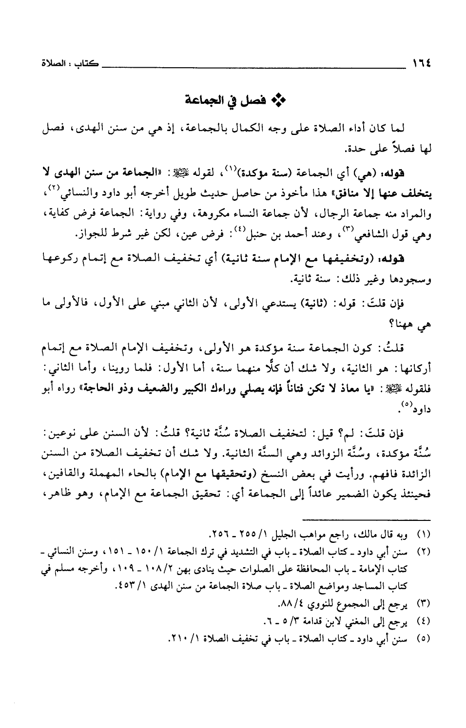 قلت: كون الجماعة سنة مؤكدة هو الأولى، وتخفيف الإمام الصلاة مع إتمام أركانها: هو الثانية، ولاشك أن كلاً منهما سنة، أما الأول: فلما روينا، وأما الثاني: فلقوله عليه السلام: "يا معاذ لا تكن فتاناً فإنه يصلي وراءك الكبير والضعيف وذو الحاجة" رواه أبو داود.