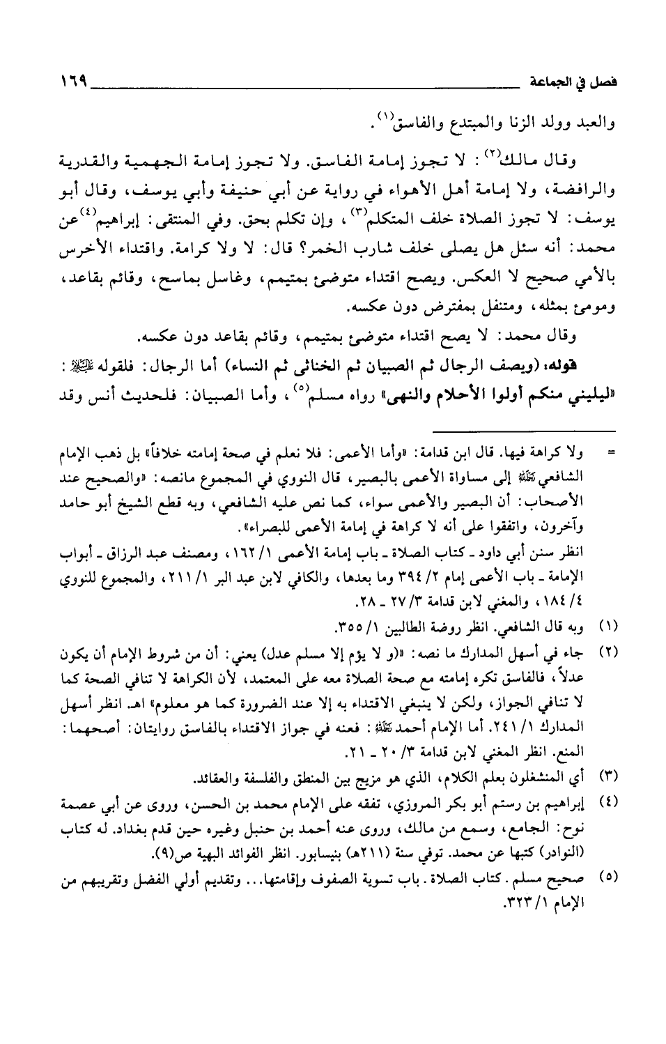 وقال مالك: لا تجوز إمامة الفاسق. ولا تجوز إمامة الجهمية والقدرية والرافضة، ولا إمامة أهل الأهواء في رواية عن أبي حنيفة وأبي يوسف، وقال أبو يوسف: لا تجوز الصلاة خلف المتكلم، وإن تكلم بحق. وفي المنتقى: إبراهيم عن محمد: أنه سئل هل يصلى خلف شارب الخمر؟ قال: لا ولا كرامة. واقتداء الأخرس بالأمي صحيح لا العكس. ويصح اقتداء متوضئ بمتيمم، وغاسل بمساح، وقائم بقاعد، ومومئ بمثله، ومتنفل بمفترض دون عكسه.