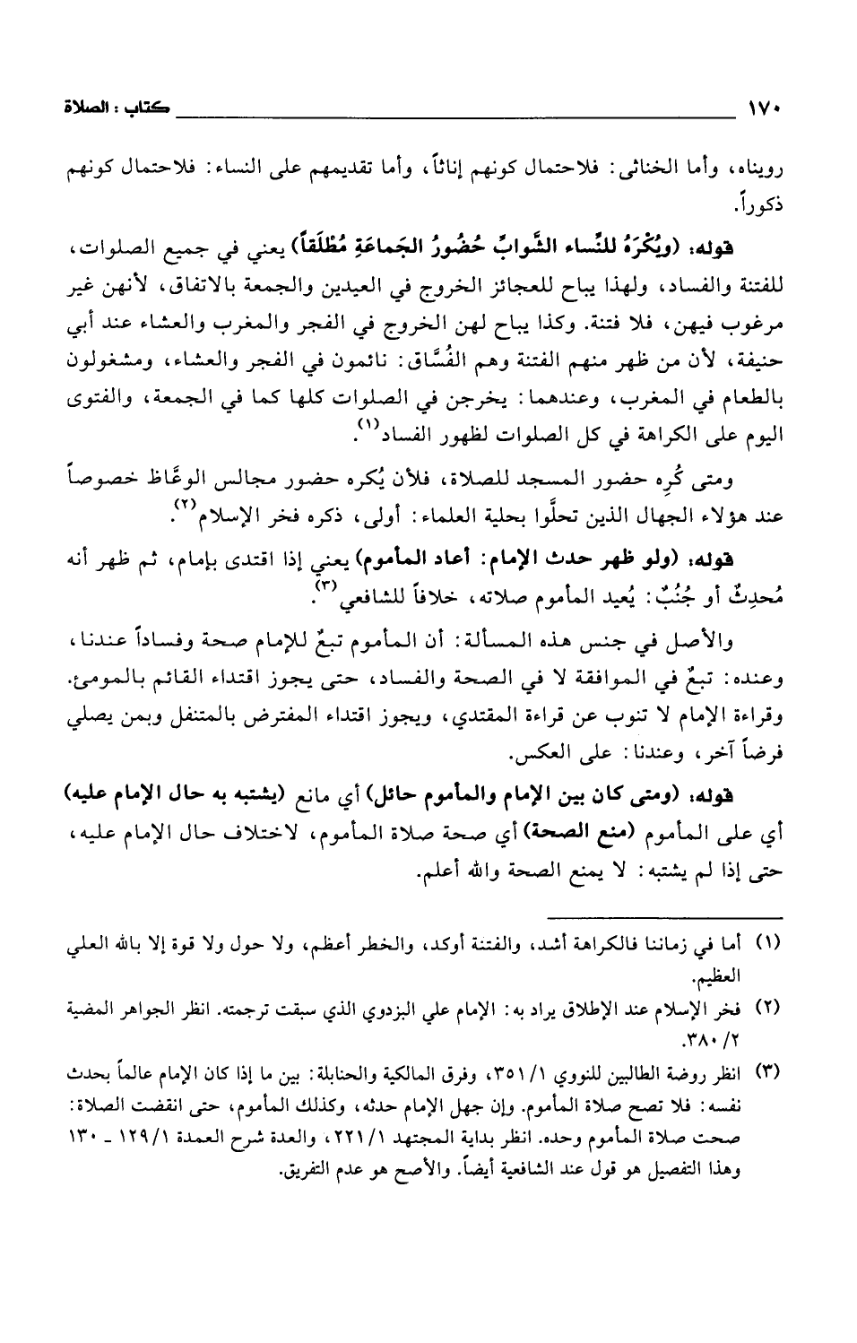 قوله: (ويكره للنساء الشواب حضور الجماعة مطلقاً) يعني في جميع الصلوات، للفتنة والفساد، ولهذا يباح للعجائز الخروج في العيدين والجمعة بالاتفاق، لأنهن غير مرغوب فيهن، فلا فتنة. وكذا يباح لهن الخروج في الفجر والمغرب والعشاء عند أبي حنيفة، لأن من ظهر منهم الفتنة وهم الفساق: نائمون في الفجر والعشاء، ومشغولون بالطعام في المغرب، وعندهما: يخرجن في الصلوات كلها كما في الجمعة، والفتوى اليوم على الكراهة في كل الصلوات لظهور الفساد.