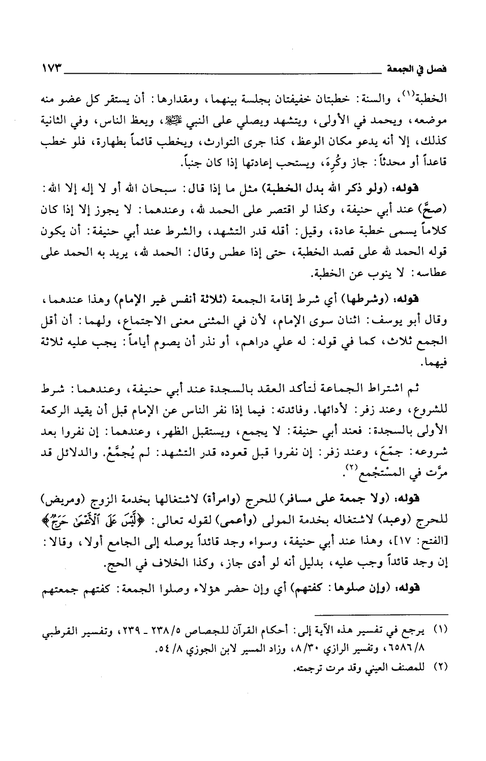ثم اشتراط الجماعة لتأكد العقد بالسجدة عند أبي حنيفة، وعندهما: شرط للشروع، وعند زفر: لأدائها. وفائدته: فيما إذا نفر الناس عن الإمام قبل أن يقيد الركعة الأولى بالسجدة: فعند أبي حنيفة: لا يجمع، ويستقبل الظهر، وعندهما: إن نفروا بعد شروعه: جمع، وعند زفر: إن نفروا قبل قعوده قدر التشهد: لم يجمع. والدلائل قد مرت في المستجمع.