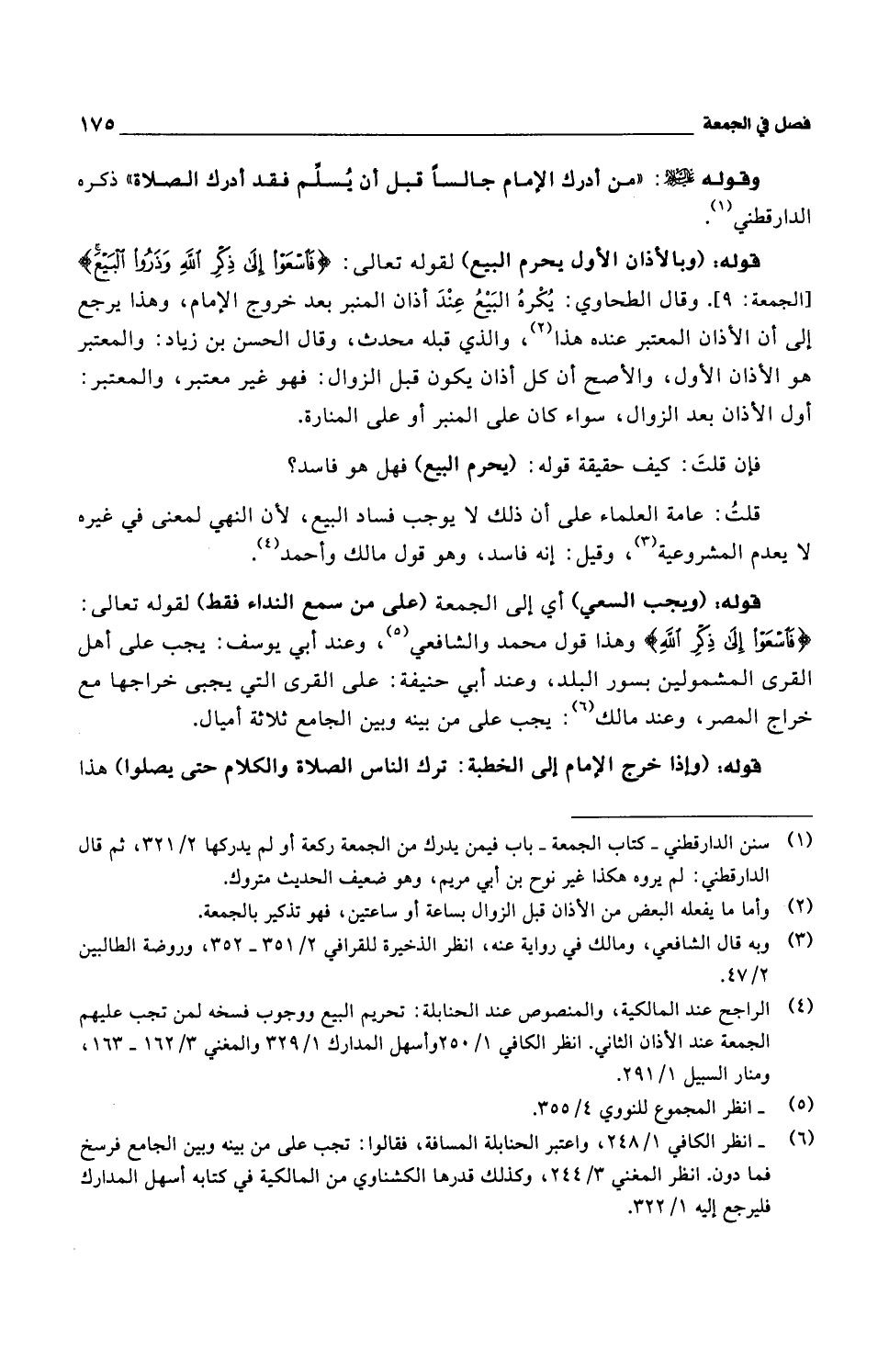 قوله: (وبالأذان الأول يحرم البيع) لقوله تعالى: {فَاسْعَوْا إِلَى ذِكْرِ اللَّهِ وَذَرُوا الْبَيْعَ} [الجمعة: 9]. وقال الطحاوي: يكره البيع عند أذان المنبر بعد خروج الإمام، وهذا يرجع إلى أن الأذان المعتبر عنده هذا، والذي قبله محدث، وقال الحسن بن زياد: والمعتبر هو الأذان الأول، والأصح أن كل أذان يكون قبل الزوال: فهو غير معتبر، والمعتبر: أول الأذان بعد الزوال، سواء كان على المنبر أو على المنارة.