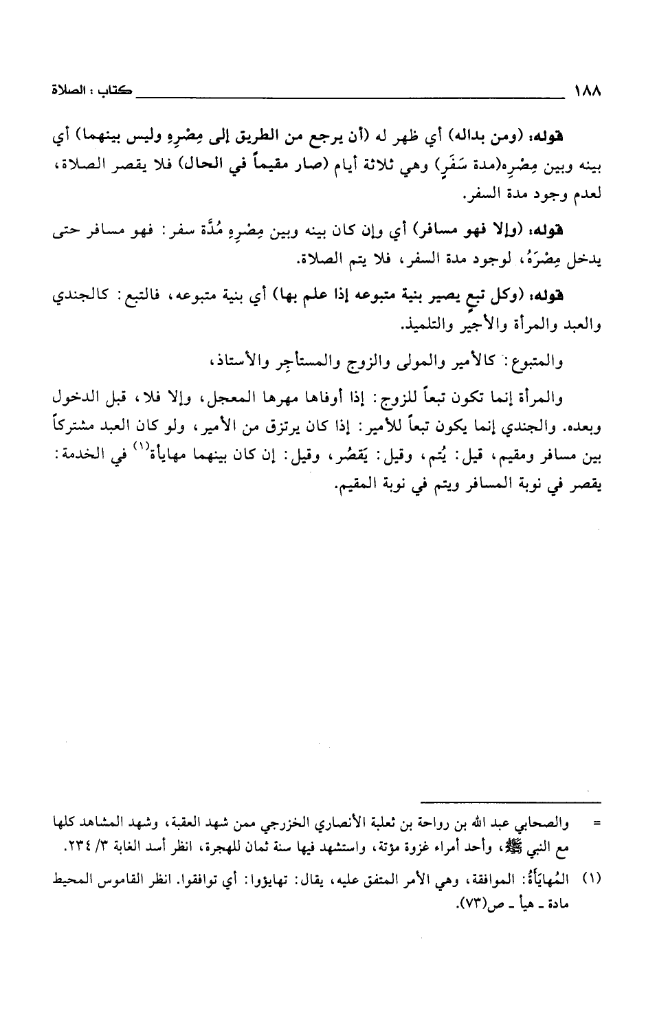 والمرأة إنما تكون تبعاً للزوج: إذا أوفاها مهرها المعجل، وإلا فلا، قبل الدخول وبعده. والجندي إنما يكون تبعاً للأمير: إذا كان يرتزق من الأمير، ولو كان العبد مشتركاً بين مسافر ومقيم، قيل: يتم، وقيل: يقصر، وقيل: إن كان بينهما مهايأة في الخدمة: يقصر في نوبة المسافر ويتم في نوبة المقيم.