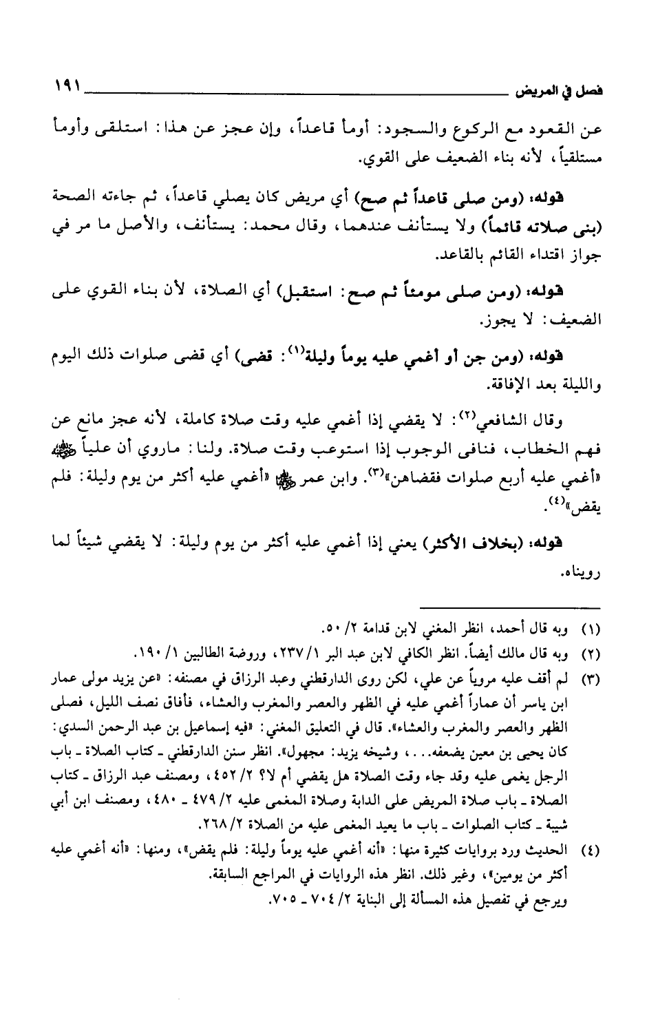 قوله: (ومن جن أو أغمي عليه يوماً وليلة: قضى) أي قضى صلوات ذلك اليوم والليلة بعد الإفاقة.