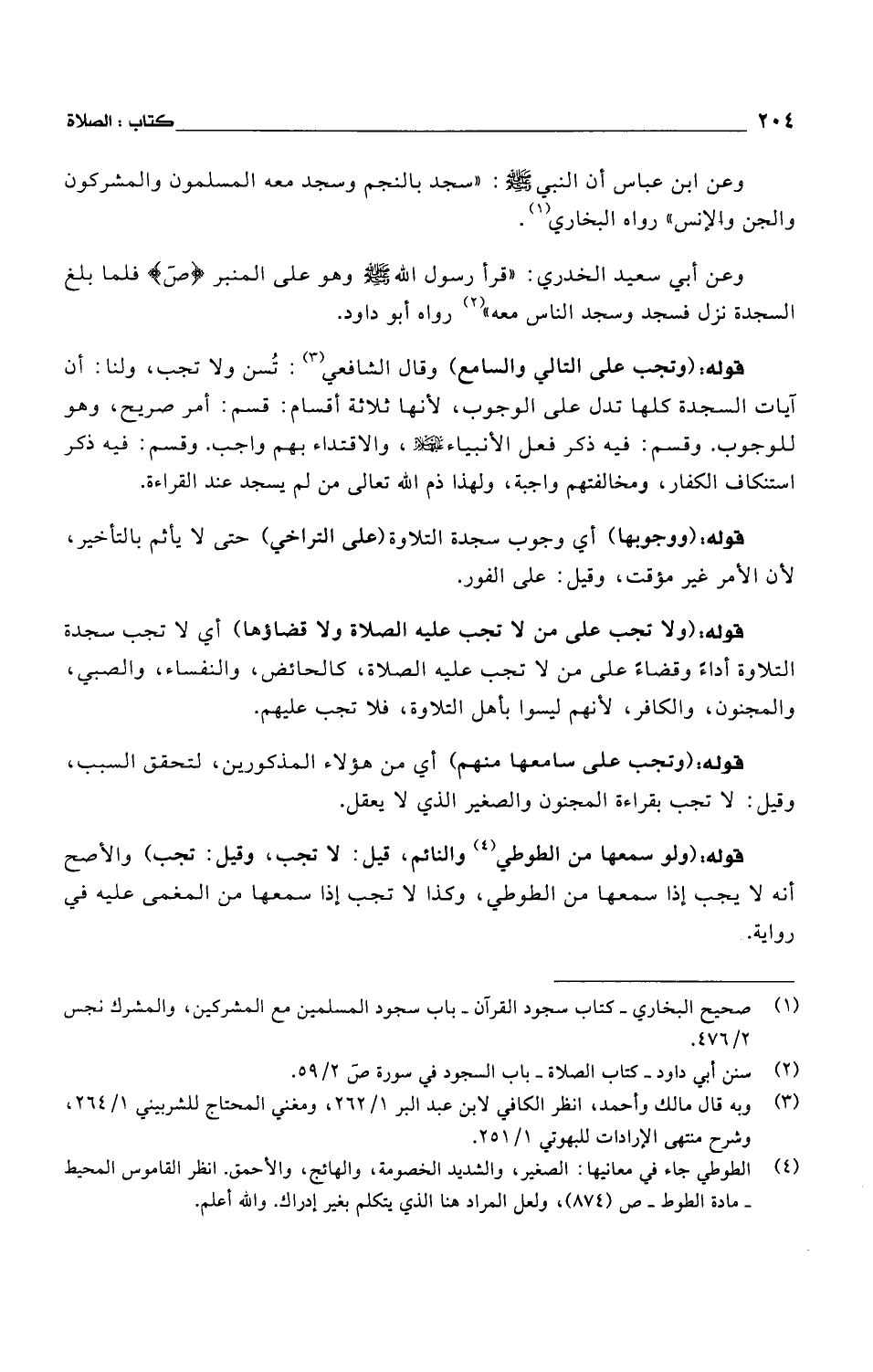 قوله: (ولا تجب على من لا تجب عليه الصلاة ولا قضاؤها) أي لا تجب سجدة التلاوة أداء وقضاء على من لا تجب عليه الصلاة، كالحائض، والنفساء، والصبي، والمجنون، والكافر، لأنهم ليسوا بأهل التلاوة، فلا تجب عليهم.