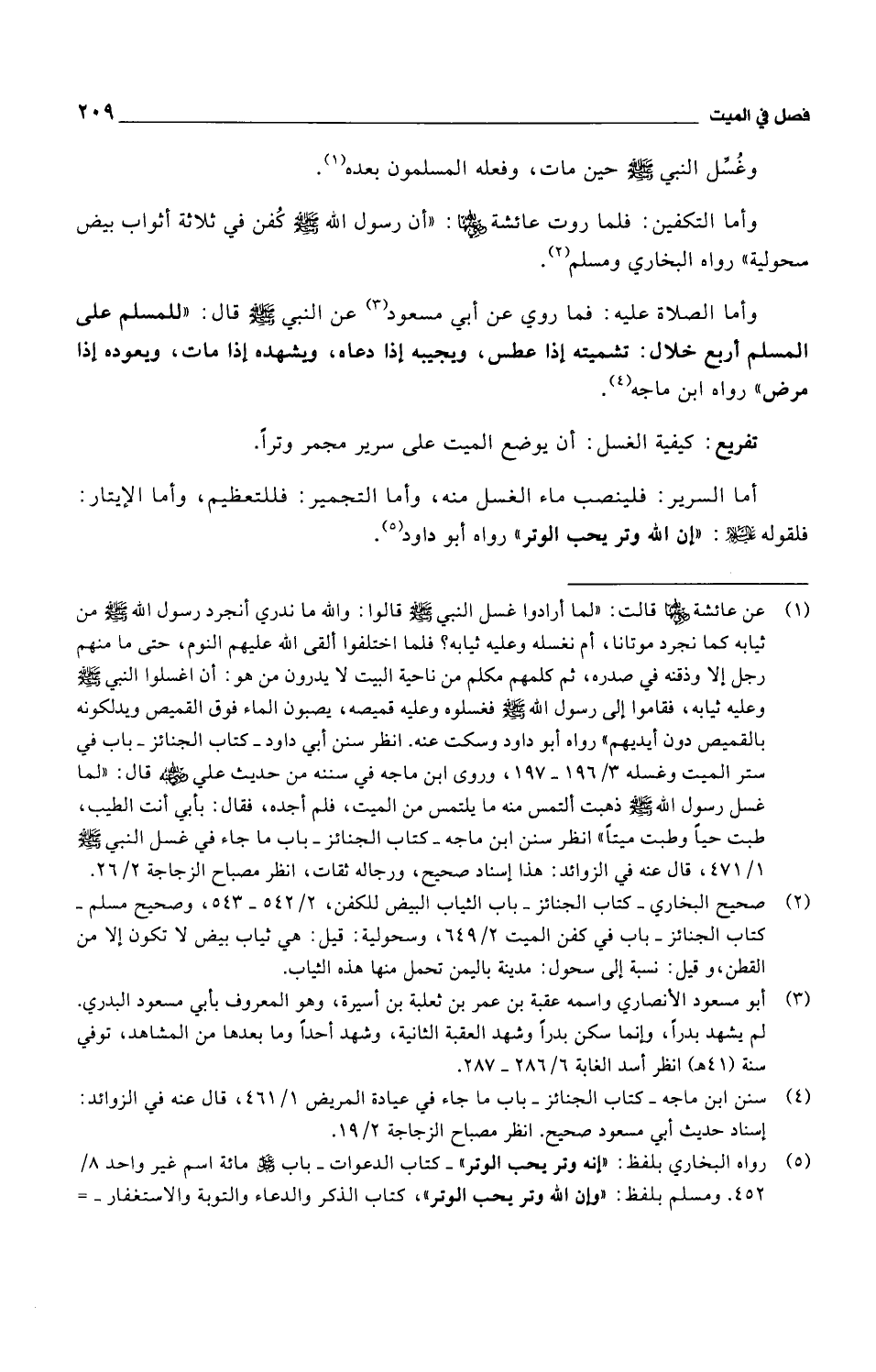 وأما التكفين: فلما روت عائشة رضي الله عنها: "أن رسول الله صلى الله عليه وسلم كُفن في ثلاثة أثواب بيض سحولية" رواه البخاري ومسلم.