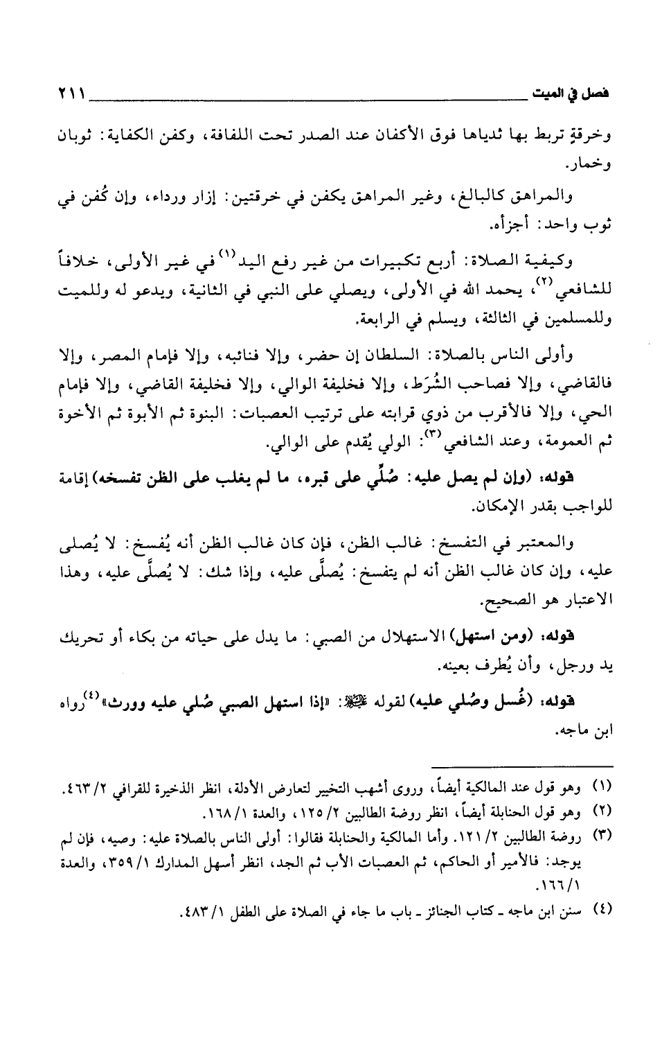 وكيفية الصلاة: أربع تكبيرات من غير رفع اليد في غير الأولى، خلافاً للشافعي، يحمد الله في الأولى، ويصلي على النبي في الثانية، ويدعو له وللميت وللمسلمين في الثالثة، ويسلم في الرابعة.