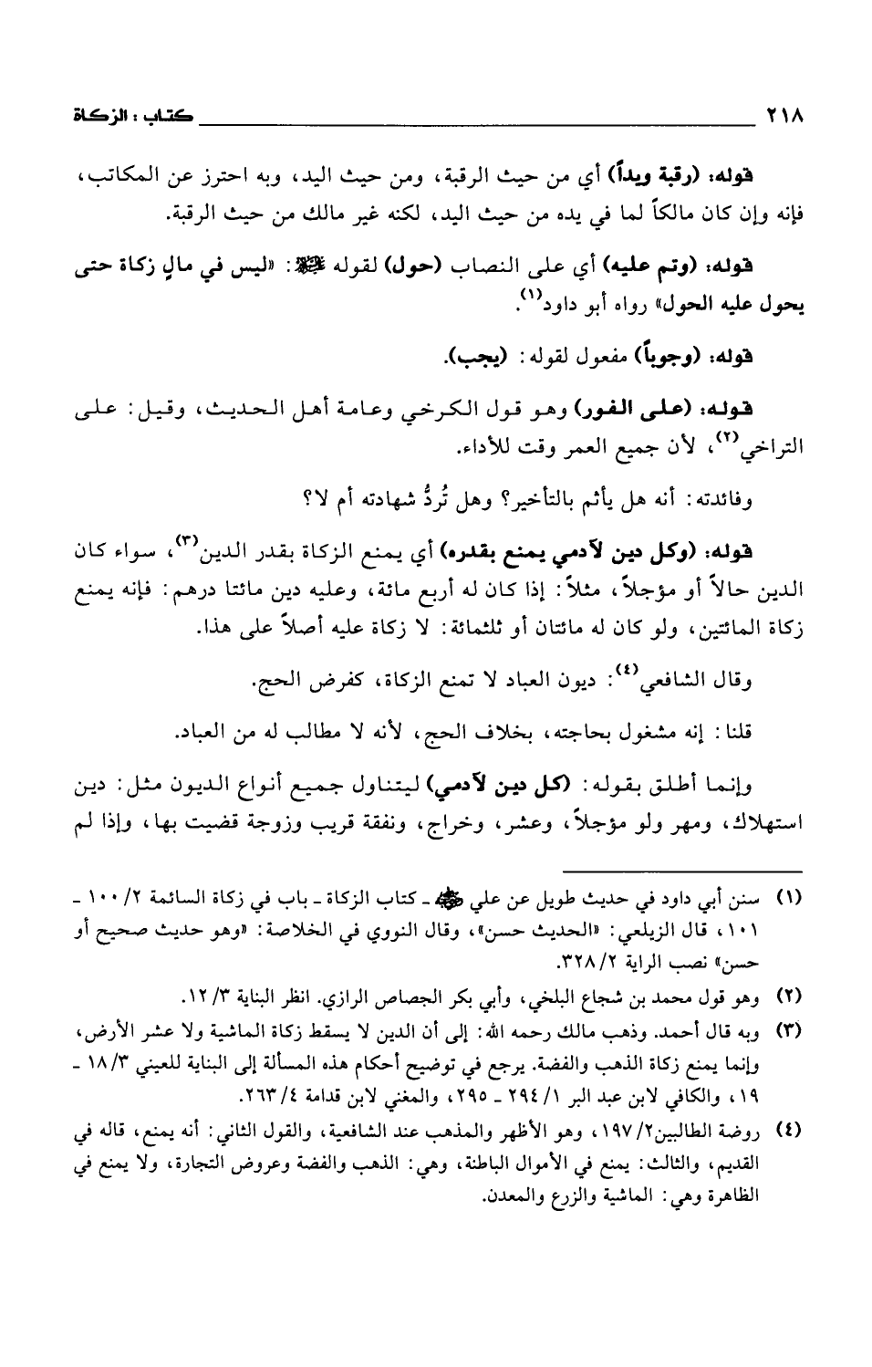 قوله: (وكل دين لآدمي يمنع بقدره) أي يمنع الزكاة بقدر الدين، سواء كان الدين حالاً أو مؤجلاً، مثلاً: إذا كان له أربع مائة، وعليه دين مائتا درهم: فإنه يمنع زكاة المائتين، ولو كان له مائتان أو ثلثمائة: لا زكاة عليه أصلاً على هذا.