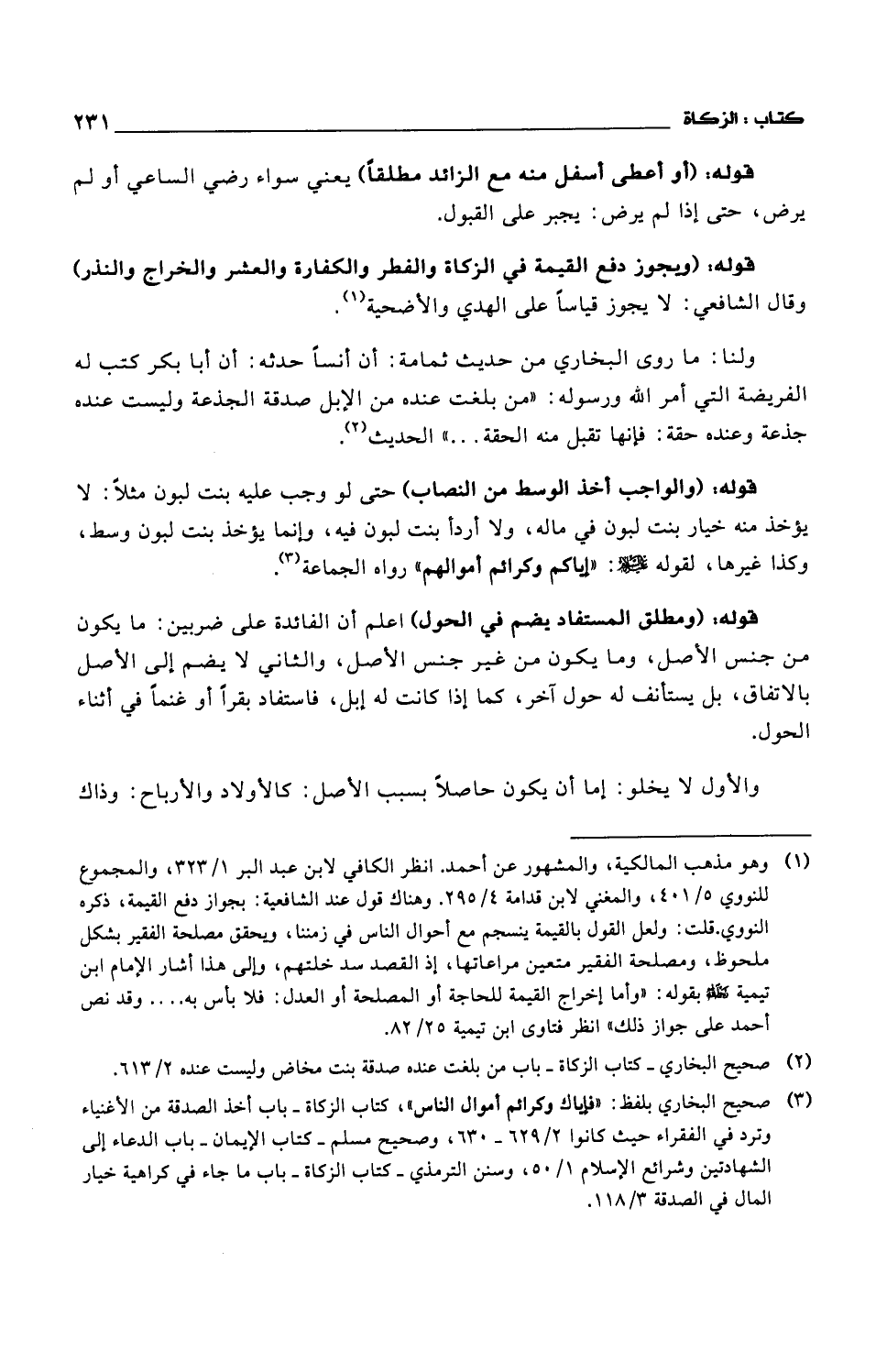 قوله: (والواجب أخذ الوسط من النصاب) حتى لو وجب عليه بنت لبون مثلاً: لا يؤخذ منه خيار بنت لبون في ماله، ولا أردأ بنت لبون فيه، وإنما يؤخذ بنت لبون وسط، وكذا غيرها، لقوله عليه السلام: "إياكم وكرائم أموالهم" رواه الجماعة.