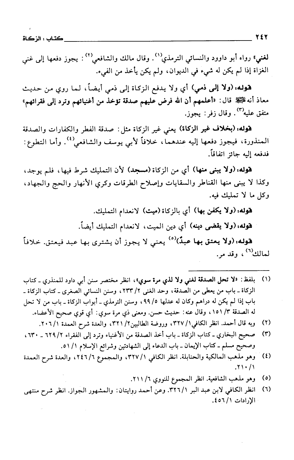 قوله: (ولا يبنى منها) أي من الزكاة (مسجد) لأن التمليك شرط فيها، فلم يوجد، وكذا لا يبنى منها القناطر والسقايات وإصلاح الطرقات وكري الأنهار والحج والجهاد، وكل ما لا تمليك فيه.