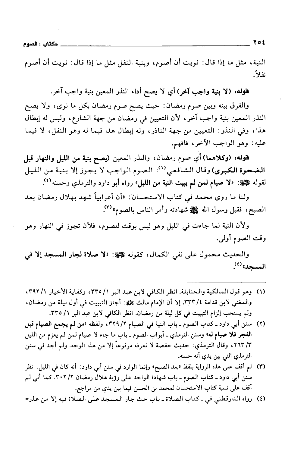 قوله: (وكلاهما) أي صوم رمضان، والنذر المعين (يصح بنية من الليل والنهار قبل الضحوة الكبرى) وقال الشافعي: الصوم الواجب لا يجوز إلا بنية من الليل لقوله عليه السلام: "لا صيام لمن لم يبيت النية من الليل" رواه أبو داود والترمذي وحسنه.